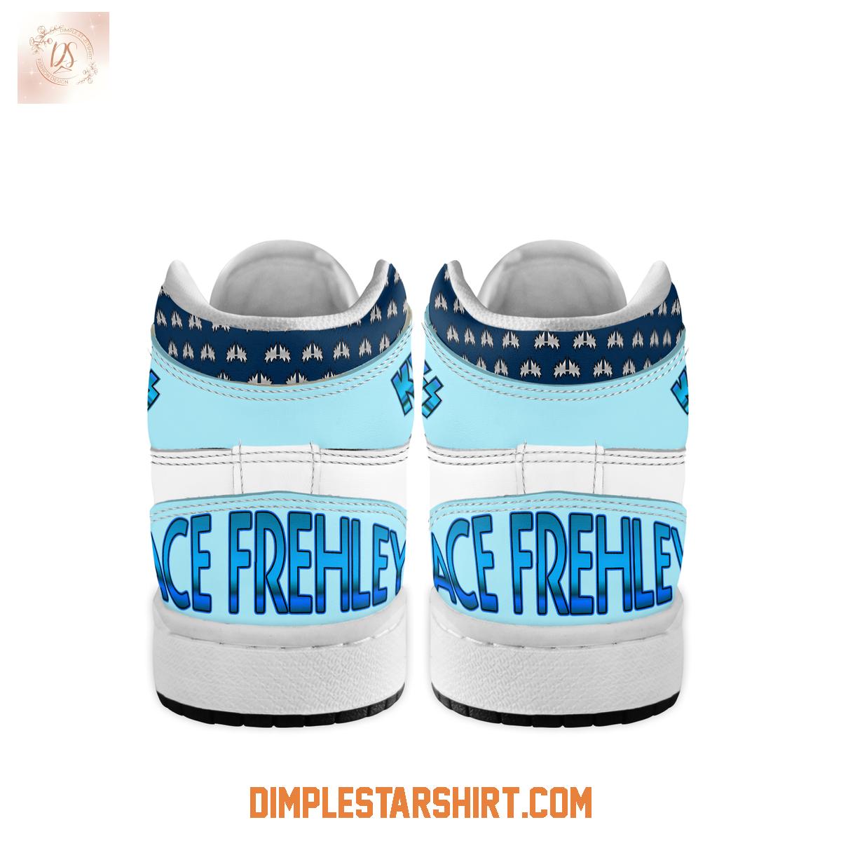 From a close inspection, the design immediately captures attention with its vibrant, custom graphics. The mid-panel and toe box prominently feature dynamic artwork of Ace Frehley in his iconic Spaceman makeup, guitar in hand, against a cosmic, star-dusted blue backdrop. His name, "ACE FREHLEY," is boldly emblazoned along the side panel, leaving no doubt about the inspiration behind this unique creation.