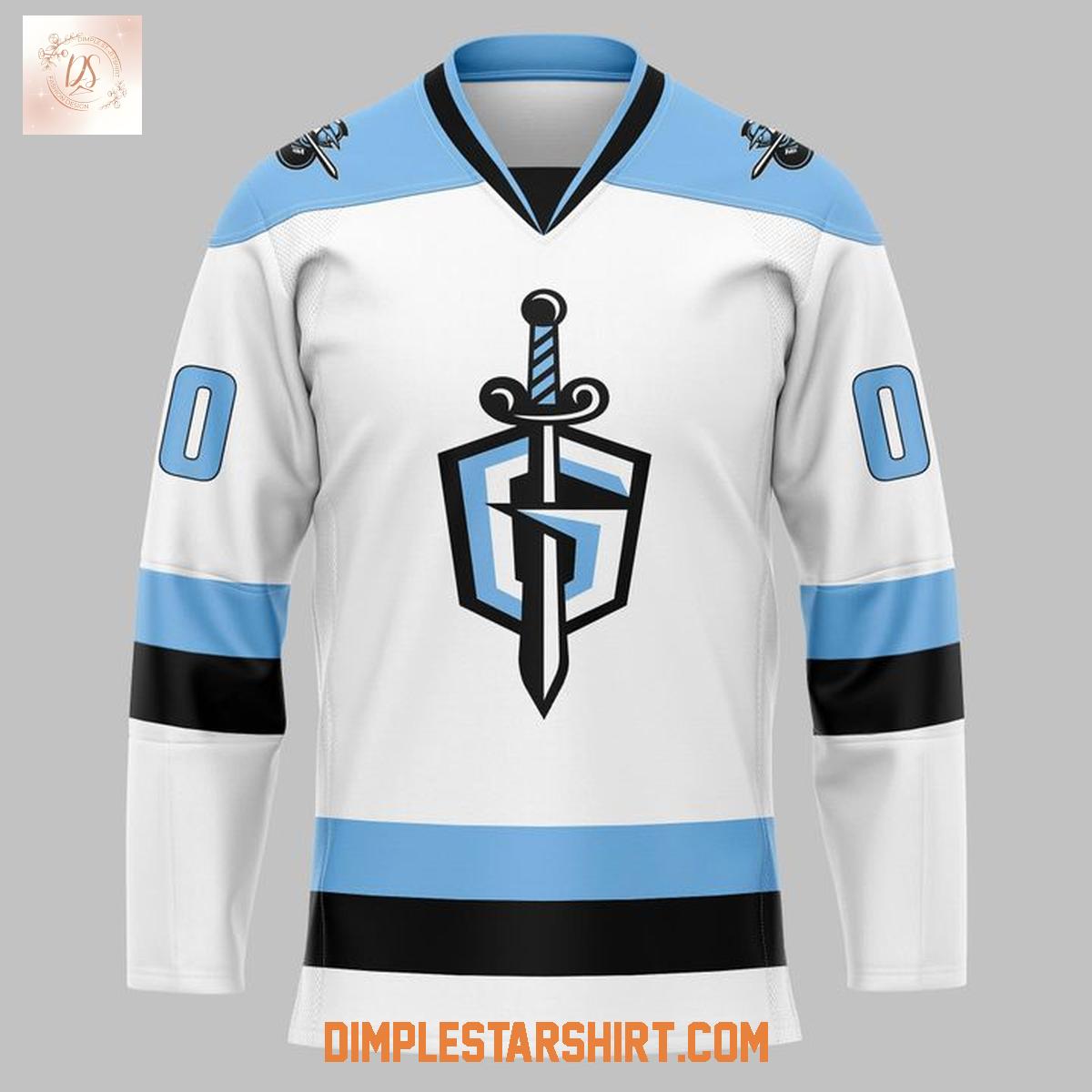 The jersey commands attention with its crisp white base, accented by vibrant light blue and sharp black elements. Dominating the front is the Atlanta Gladiators' iconic crest – a powerful shield emblazoned with a sword and the distinctive "G" – symbolizing the team's fierce spirit on the ice. The classic V-neck collar, trimmed in black and light blue, offers a traditional yet comfortable fit, perfect for game-day excitement or everyday wear.