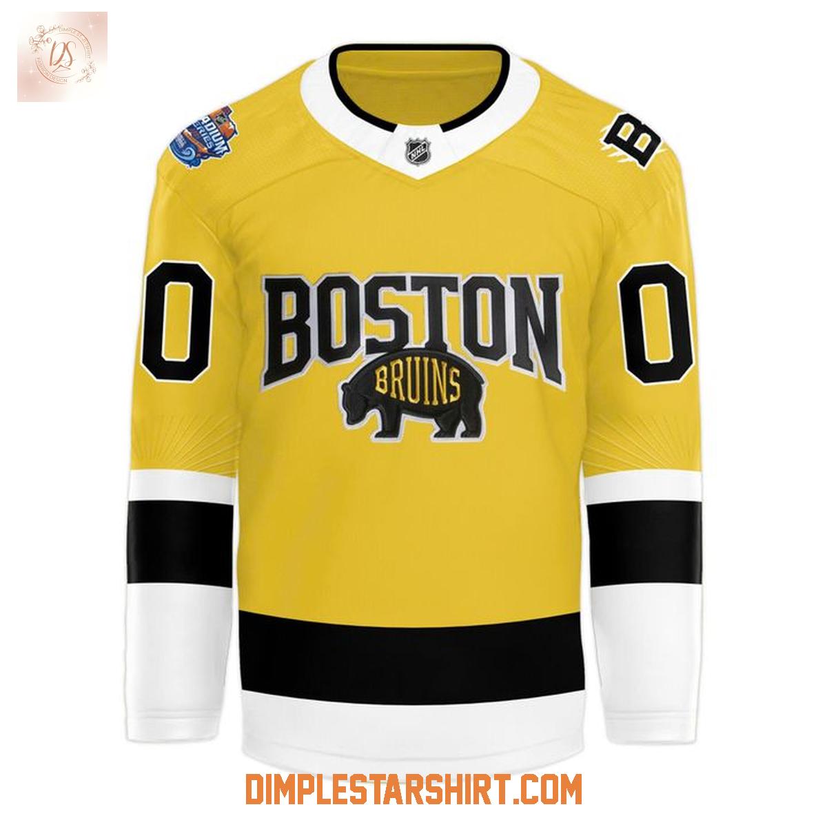The jersey features the iconic Bruins logo prominently displayed on the chest, along with the "BOSTON" wordmark. The shoulder patches commemorate the Stadium Series event. The design includes contrasting stripes on the sleeves and bottom hem, adding to the authentic hockey aesthetic. You can even personalize it with your own name and number on the back, making it a truly unique piece of fan gear.