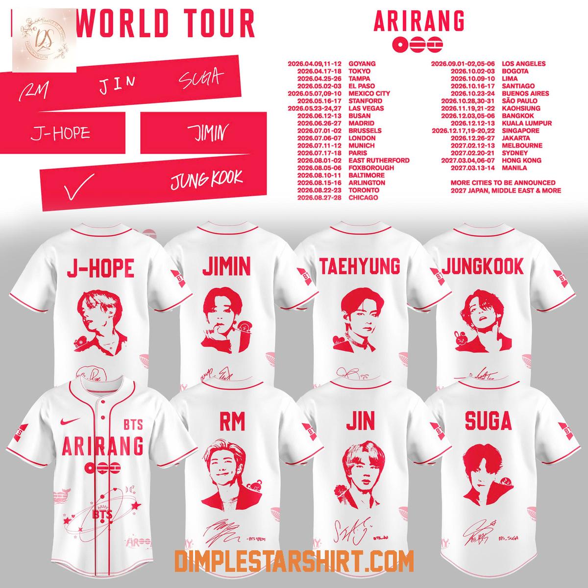 Relive the excitement of the anticipated tour with the BTS Arirang World Tour 2026 Baseball Jersey. This unique jersey commemorates the global sensation's journey, blending the worlds of music and sporty style. It’s more than just apparel; it’s a wearable memory of what promises to be an unforgettable concert experience.