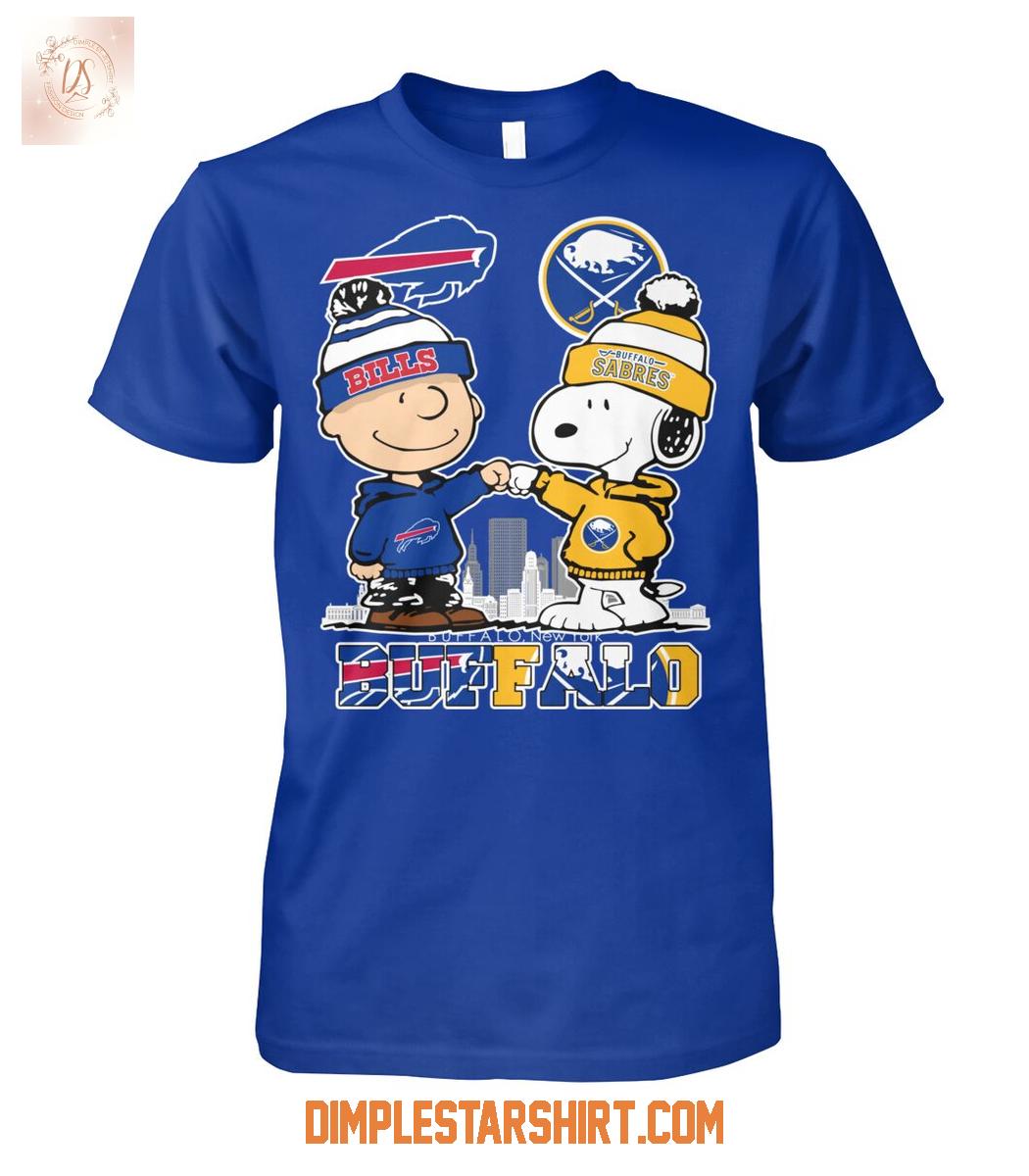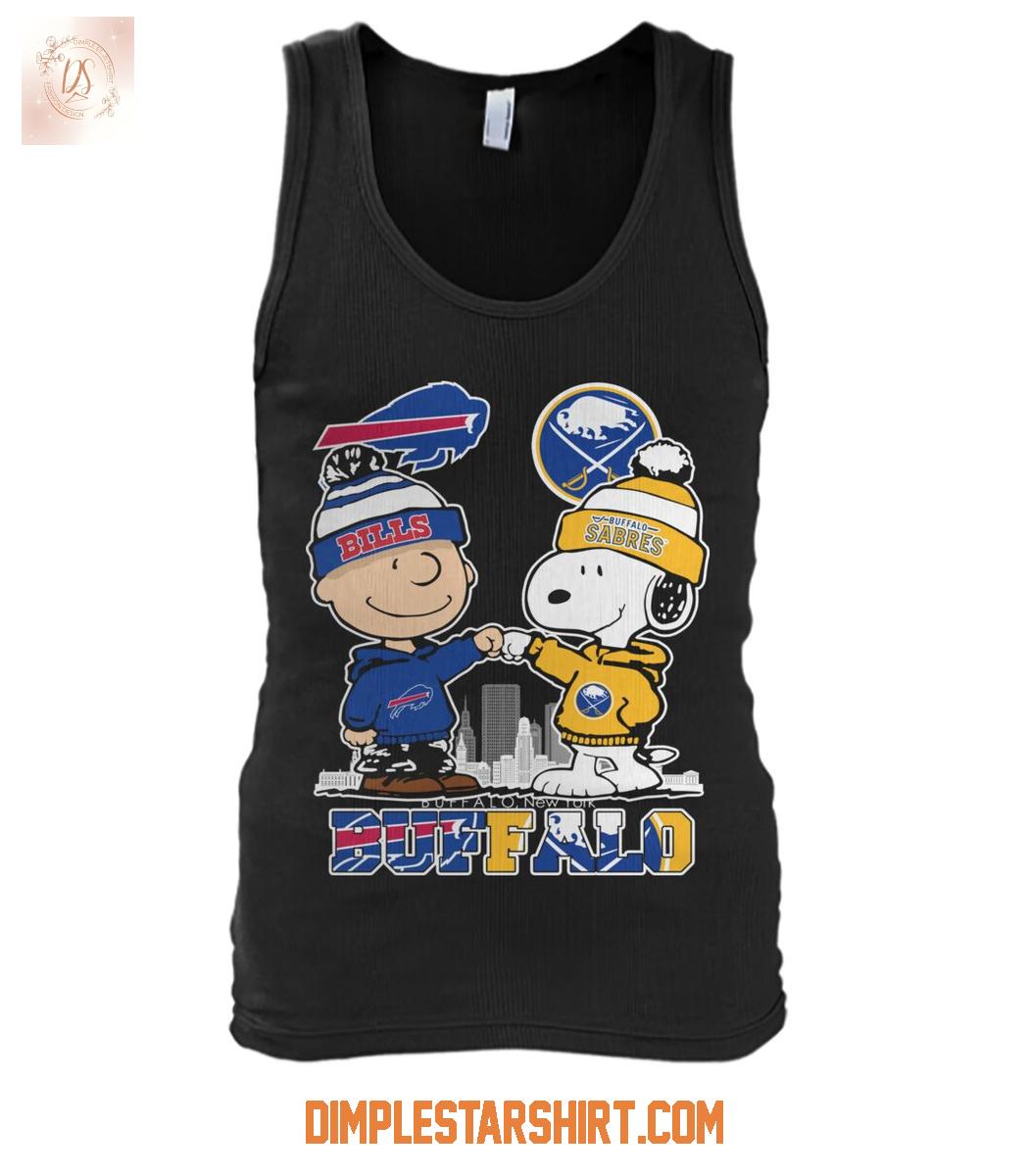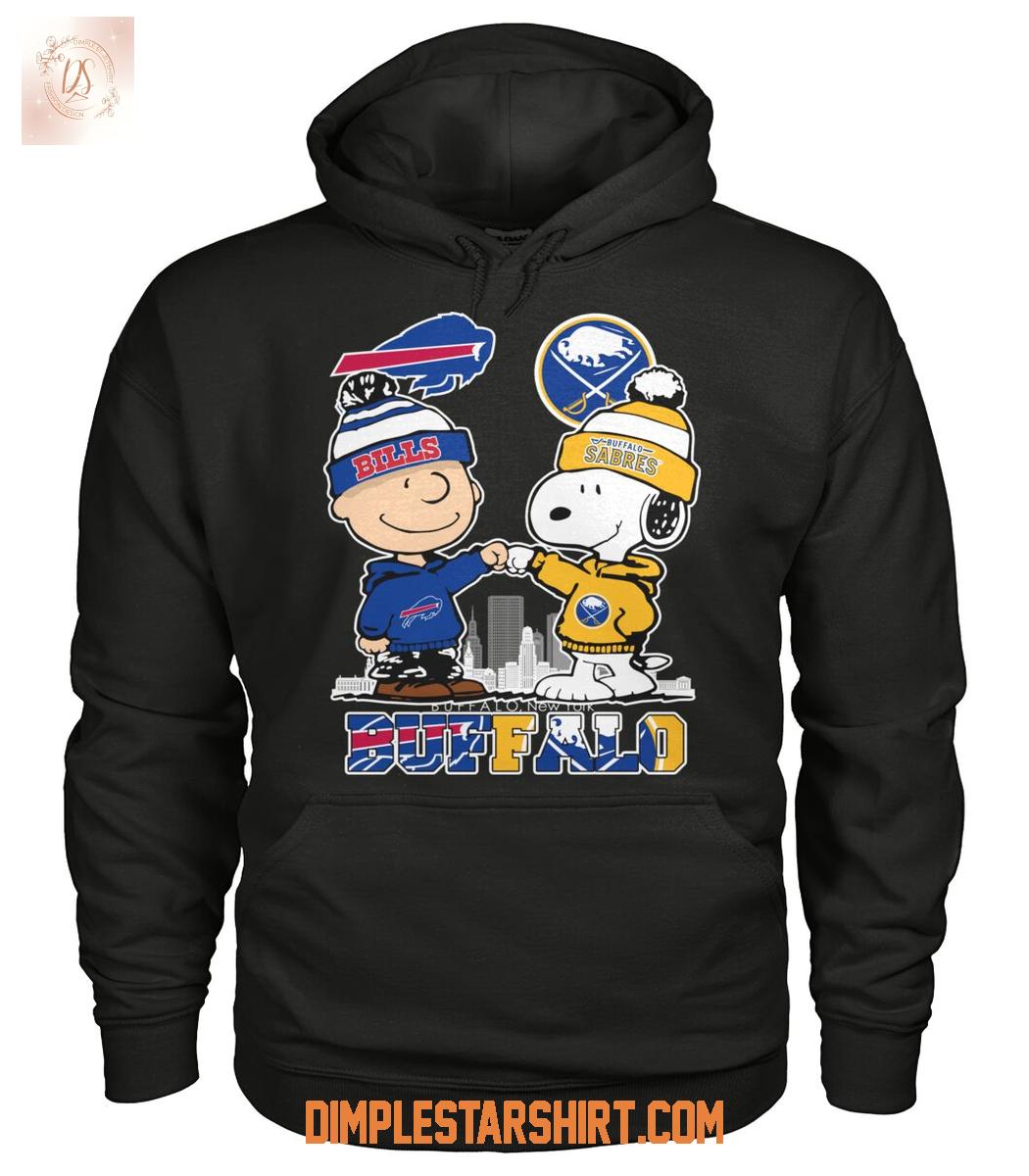 The design immediately captures attention with beloved characters Charlie Brown and Snoopy, transformed into spirited Buffalo sports enthusiasts. Charlie Brown proudly sports a Buffalo Bills beanie and a blue hoodie adorned with the team's charging buffalo logo. Beside him, Snoopy, ever the loyal companion, dons a Buffalo Sabres beanie and a gold hoodie featuring the classic crossed swords emblem, signifying his allegiance to the ice. Their friendly fist bump over the Buffalo skyline embodies the shared community spirit of fans across both football and hockey.