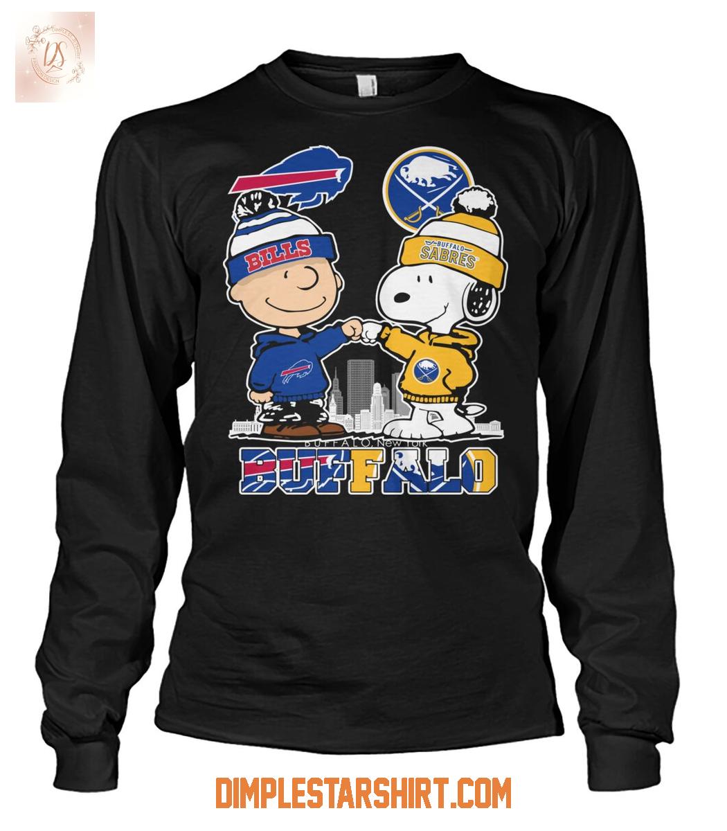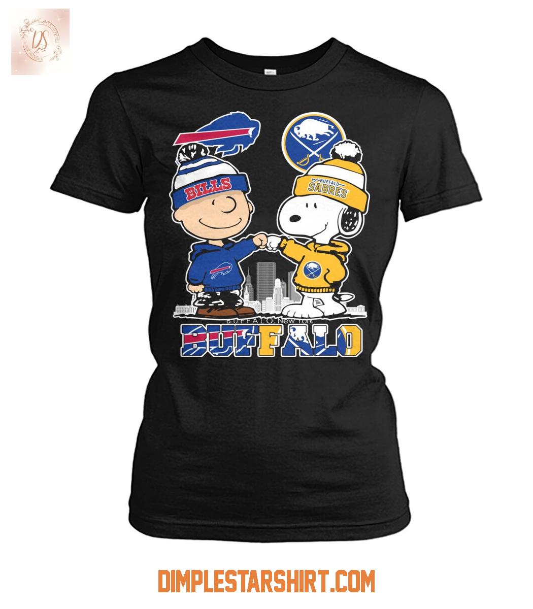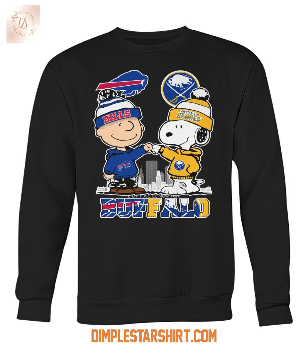 The design immediately captures attention with beloved characters Charlie Brown and Snoopy, transformed into spirited Buffalo sports enthusiasts. Charlie Brown proudly sports a Buffalo Bills beanie and a blue hoodie adorned with the team's charging buffalo logo. Beside him, Snoopy, ever the loyal companion, dons a Buffalo Sabres beanie and a gold hoodie featuring the classic crossed swords emblem, signifying his allegiance to the ice. Their friendly fist bump over the Buffalo skyline embodies the shared community spirit of fans across both football and hockey.