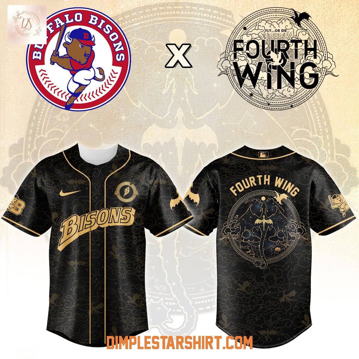 The jersey proudly displays the iconic Buffalo Bisons logo across the chest, rendered in a striking gold that pops against the sleek black base. On the back, the Fourth Wing emblem is prominently featured, clearly showcasing the collaborative nature of this special edition item. The sleeves are thoughtfully adorned with complementary design elements that enhance the jersey's overall aesthetic appeal, creating a cohesive and visually stunning garment.