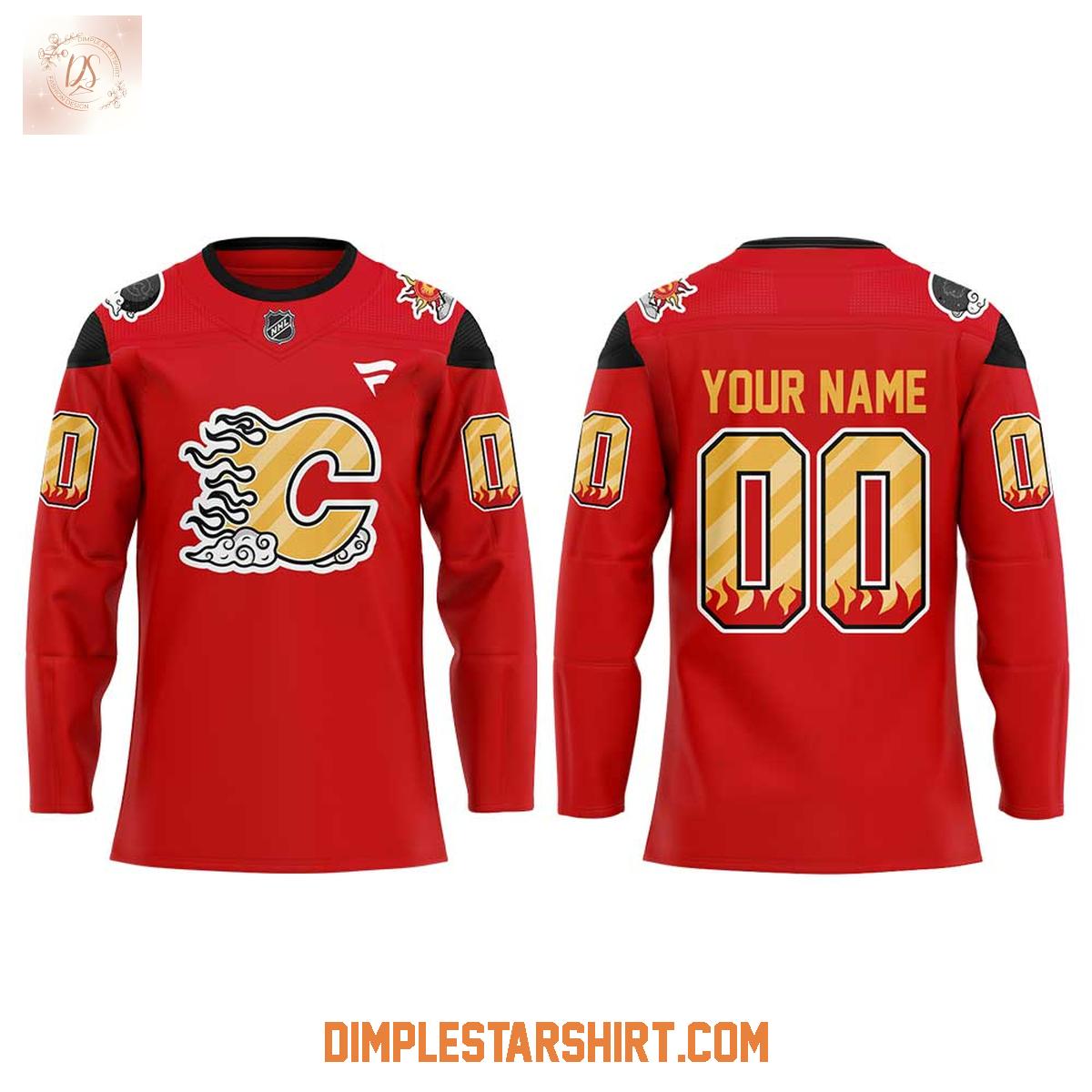 Celebrate the Year of the Dragon in style with the Calgary Flames Lunar New Years Hockey Jersey. This unique jersey blends the iconic Flames logo with design elements inspired by traditional Chinese New Year celebrations, creating a striking look that honors both hockey fandom and cultural heritage. It's more than just fan apparel; it's a statement piece that reflects passion and appreciation.