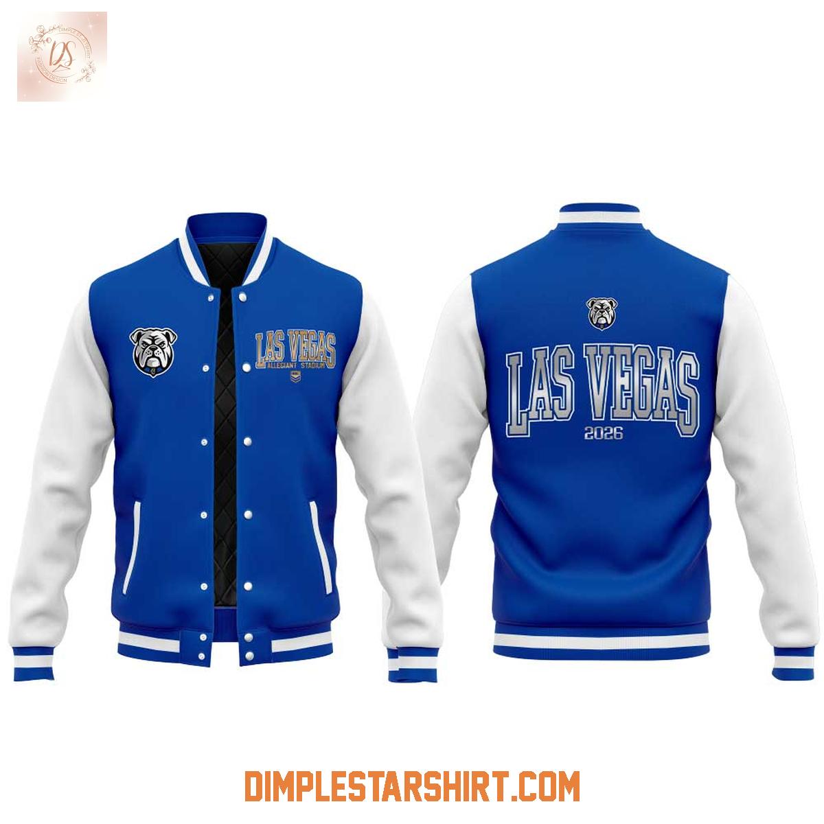 The jacket boasts a predominantly royal blue body, beautifully contrasted by crisp white sleeves, creating a visually appealing and sporty aesthetic. The iconic Bulldogs logo is prominently showcased on the front, instantly recognizable and representing the team's heritage. Across the back, "Las Vegas 2026" is emblazoned in bold lettering, leaving no doubt about your allegiance and the significance of this momentous occasion. The traditional snap-button closure further enhances the authentic baseball jacket feel, adding a touch of nostalgia.