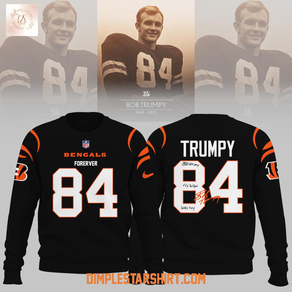 Immerse yourself in Bengals history and honor a true gridiron legend with the Cincinnati Bengals RIP Bob Trumpy Forever 80 Black Hoodie Shirt. This unique piece of fan apparel, though titled with '80', proudly features the iconic number 84, worn by the legendary tight end Bob Trumpy. It's a powerful and heartfelt tribute, designed for devoted fans who cherish the team's rich heritage and wish to celebrate one of its most revered figures.