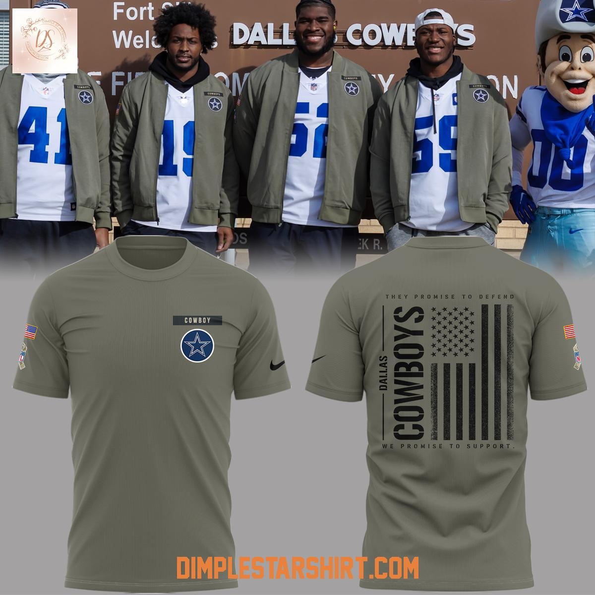 The design features a subtle yet impactful military-inspired aesthetic. The iconic Dallas Cowboys star is prominently displayed on the chest, accompanied by military-themed patches on the sleeves, all rendered in a muted, earthy color palette. The back showcases a stylized American flag design, further emphasizing the spirit of patriotism and appreciation for military service.