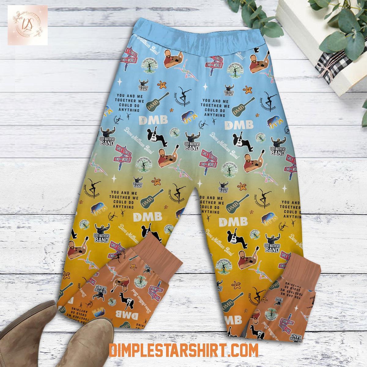 Complementing the top are the coordinating pajama bottoms, featuring an all-over print that is a treasure trove of DMB iconography. From the unmistakable "DMB" logo and the iconic dancing figure to lyrics like "YOU AND ME TOGETHER WE COULD DO ANYTHING," every detail speaks to the band's rich history. Look closely and you'll spot references to songs like "41," "Ants Marching," and "Stay Street," alongside various guitar illustrations, all set against the same calming blue-to-orange gradient. The cuffed ankles provide a snug, comfortable fit perfect for lounging.