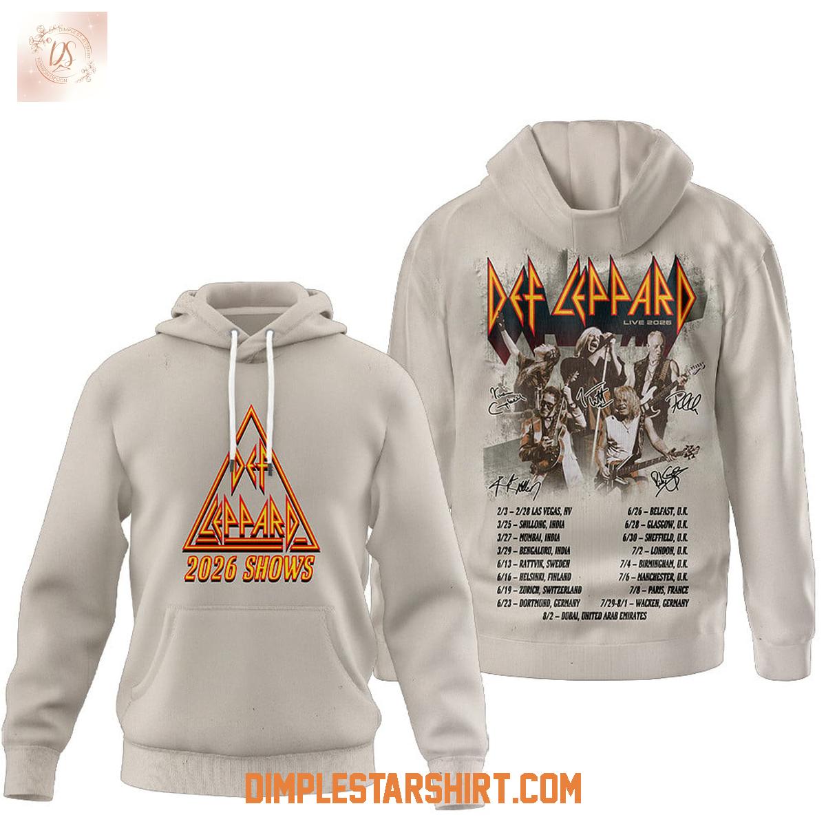 The design features iconic imagery associated with Def Leppard's 2026 tour. The front prominently displays the band's logo alongside "2026 Shows," while the back showcases tour dates and locations. The graphics are carefully applied, ensuring they withstand regular wear and washing without significant fading or cracking. This hoodie t-shirt is crafted from a comfortable and breathable cotton blend.
