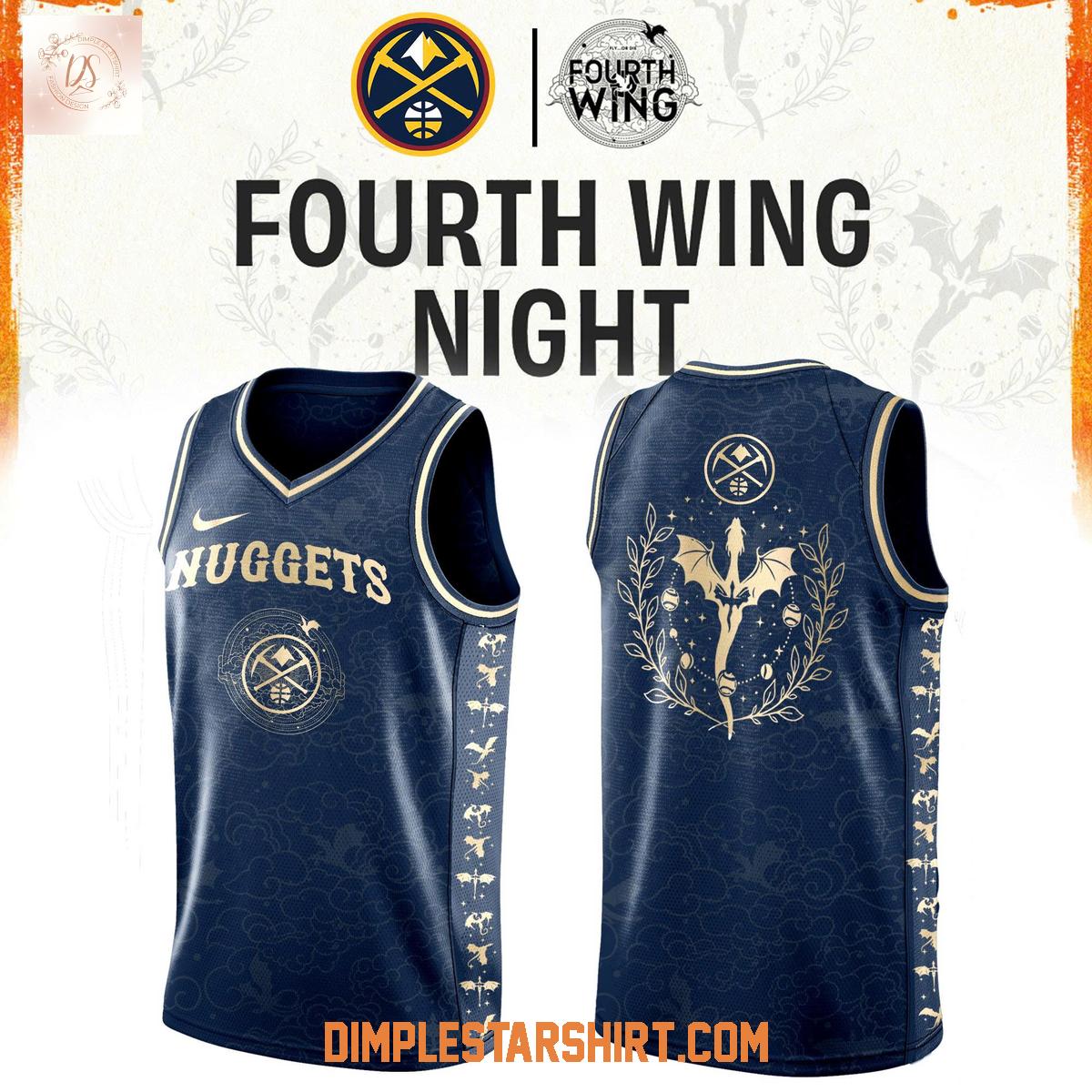 Elevate your game-day attire with the unique Denver Nuggets Fourth Wing Night Basketball Jersey. This special edition jersey blends the excitement of NBA basketball with the captivating world of fantasy, creating a standout piece for any dedicated fan. The deep navy color serves as a striking backdrop for the gold accents and intricate design elements inspired by the "Fourth Wing" theme.