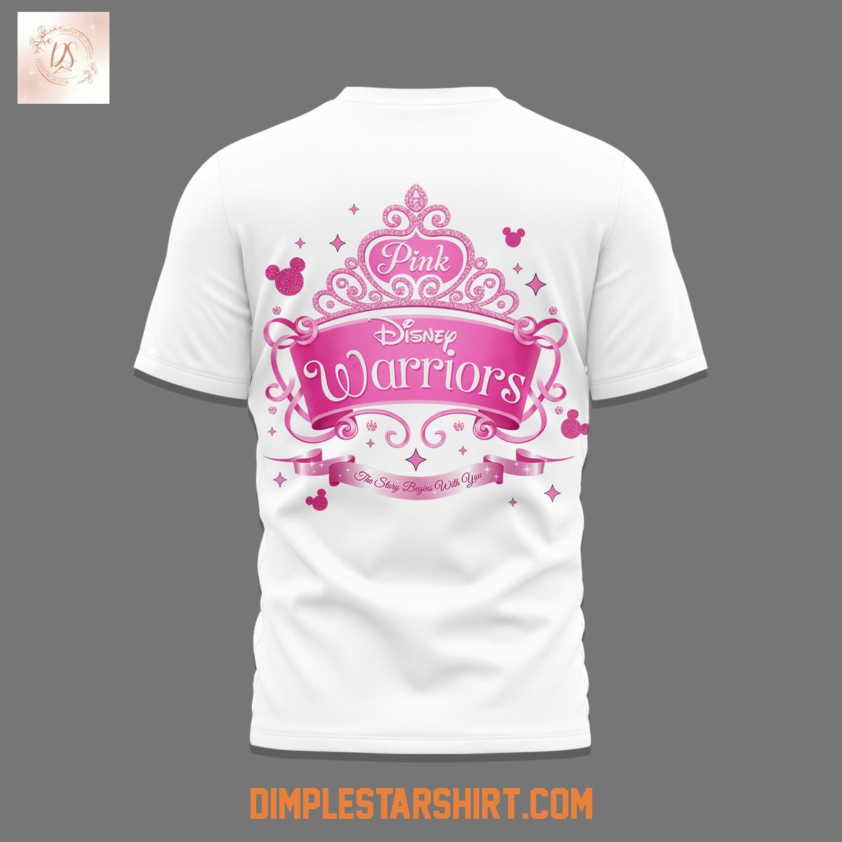 Turn to the back, and you'll find an equally striking design: a magnificent pink crown, adorned with glitter-like details, proudly declaring "Pink" at its center. Below, a bold banner proclaims "Disney Warriors," surrounded by whimsical Mickey Mouse heads and shimmering stars. A smaller banner beneath adds a personal touch, stating, "The Story Begins With You," reinforcing the message of individual empowerment and brave journeys.