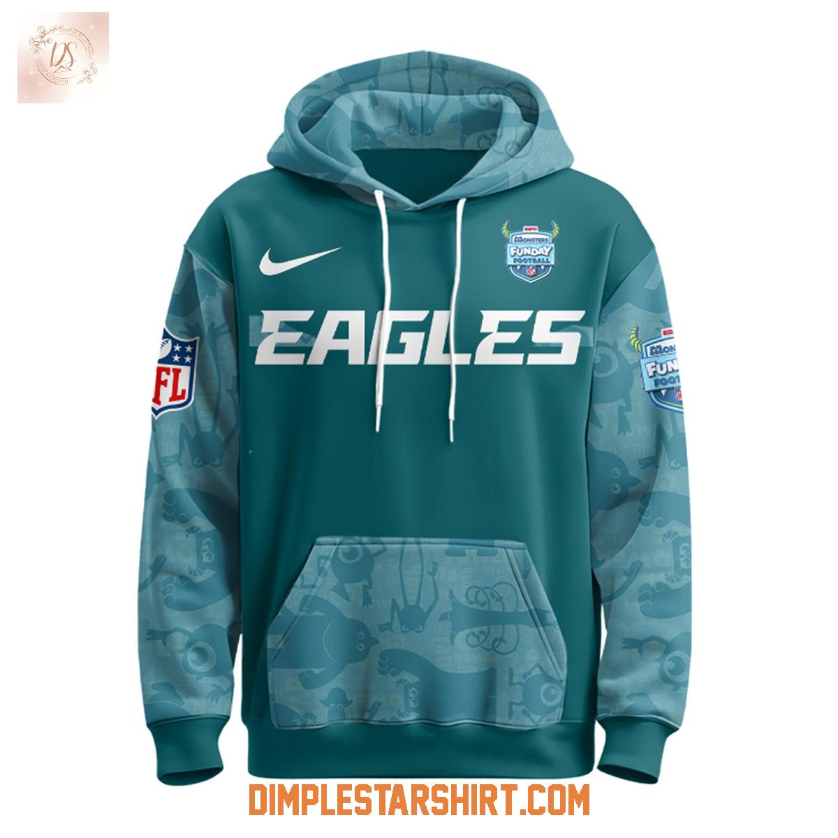 This eye-catching hoodie boasts bold Eagles graphics prominently displayed on the front, incorporating the team name and logo in a design subtly interwoven with Mike Wazowski-themed elements. The back features a large, unmistakable Eagles emblem accompanied by further character-driven artwork, ensuring your allegiance is clear from every angle. The overall design masterfully utilizes the Eagles' team colors, leaving no doubt about your unwavering support, while simultaneously injecting a delightful and unexpected twist.
