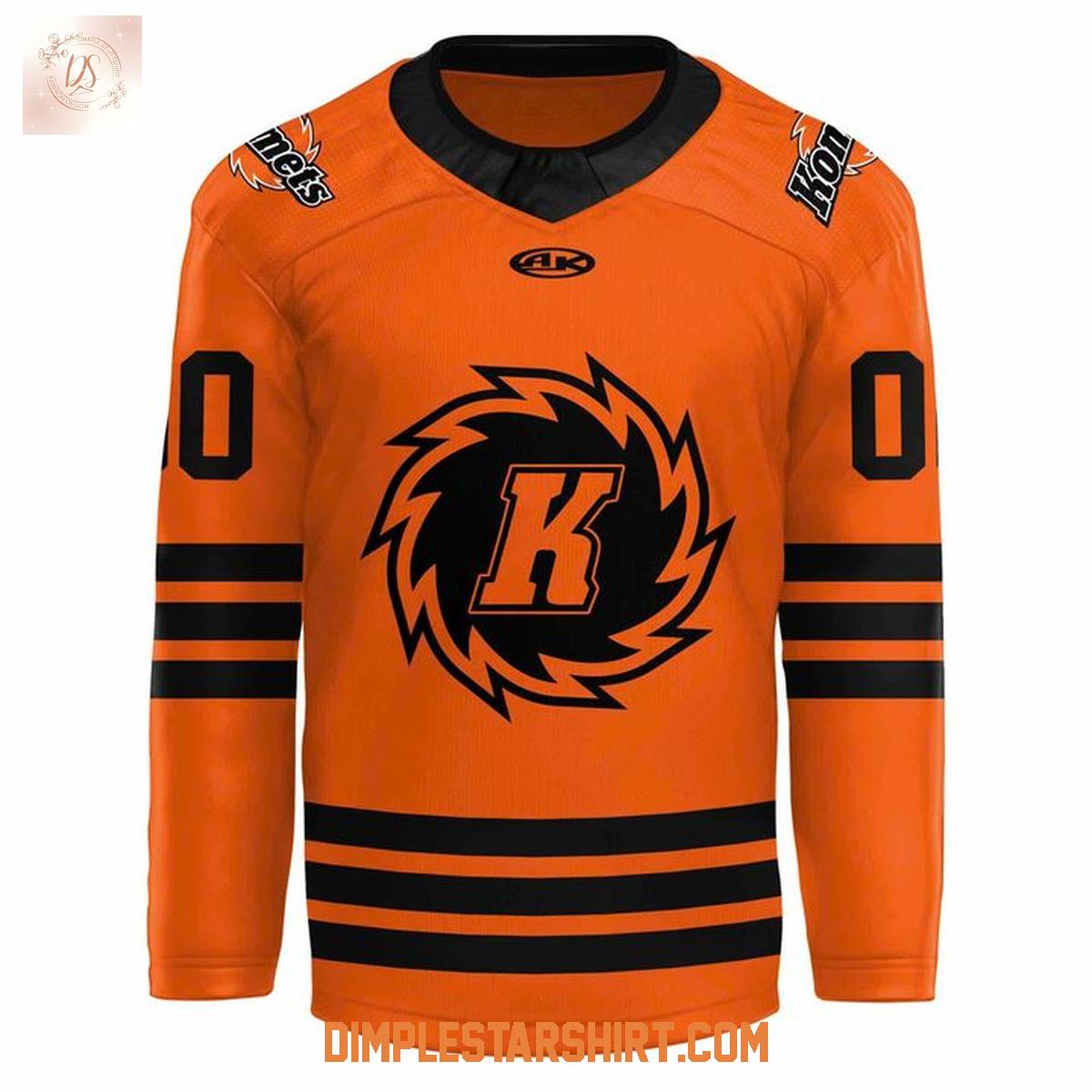 At the heart of this jersey's design is the iconic Komets "K" crest, boldly presented in a swirling black graphic on the chest. This distinctive emblem, known to all true ECHL enthusiasts, sits prominently against the bright orange backdrop. The jersey features a classic black V-neck collar, providing a comfortable fit that’s perfect for game day or casual wear.
