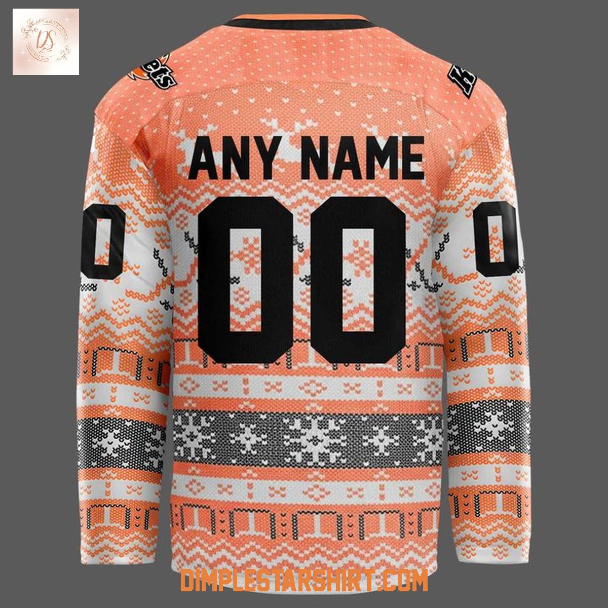 Designed to capture the essence of the Komets' popular "Ugly Christmas Sweater Nights," this jersey features a vibrant orange base adorned with a charming white and grey Fair Isle-inspired pattern. You'll spot playful reindeer, intricate snowflakes, and geometric motifs that evoke traditional holiday sweaters, all expertly integrated into a performance-ready jersey fabric.