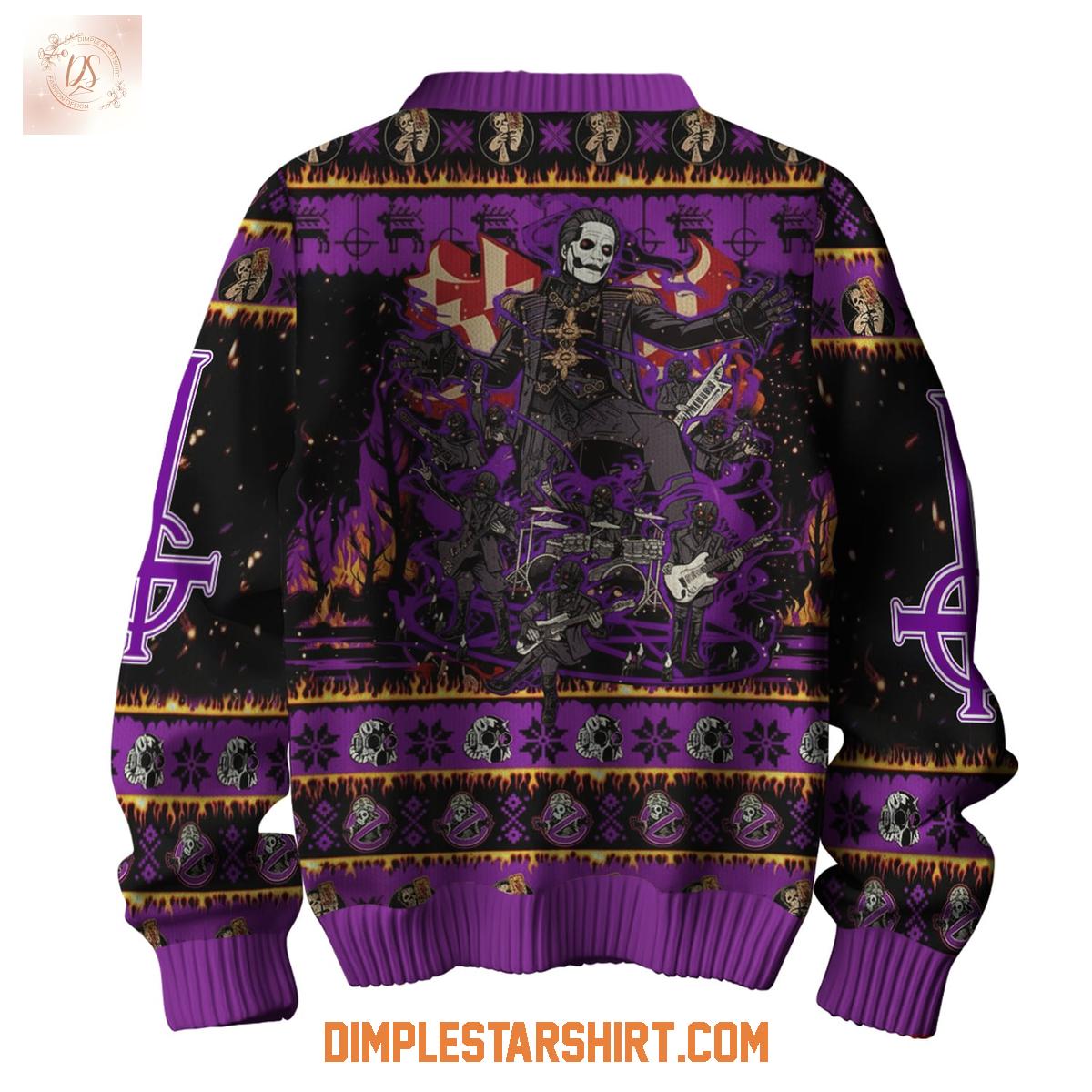 The front of this striking sweater immediately draws the eye with a vibrant depiction of a skeletal figure, reminiscent of Papa Emeritus, donning a miter and holding an apple, set against a backdrop of purple flames and a dark forest. The prominent Ghost logo, rendered in fiery red, commands attention above this scene. Intricate patterns, featuring inverted crosses and stylized skull motifs, adorn the sleeves and horizontal bands, creating a visually rich tapestry that embodies the band's dark aesthetic.