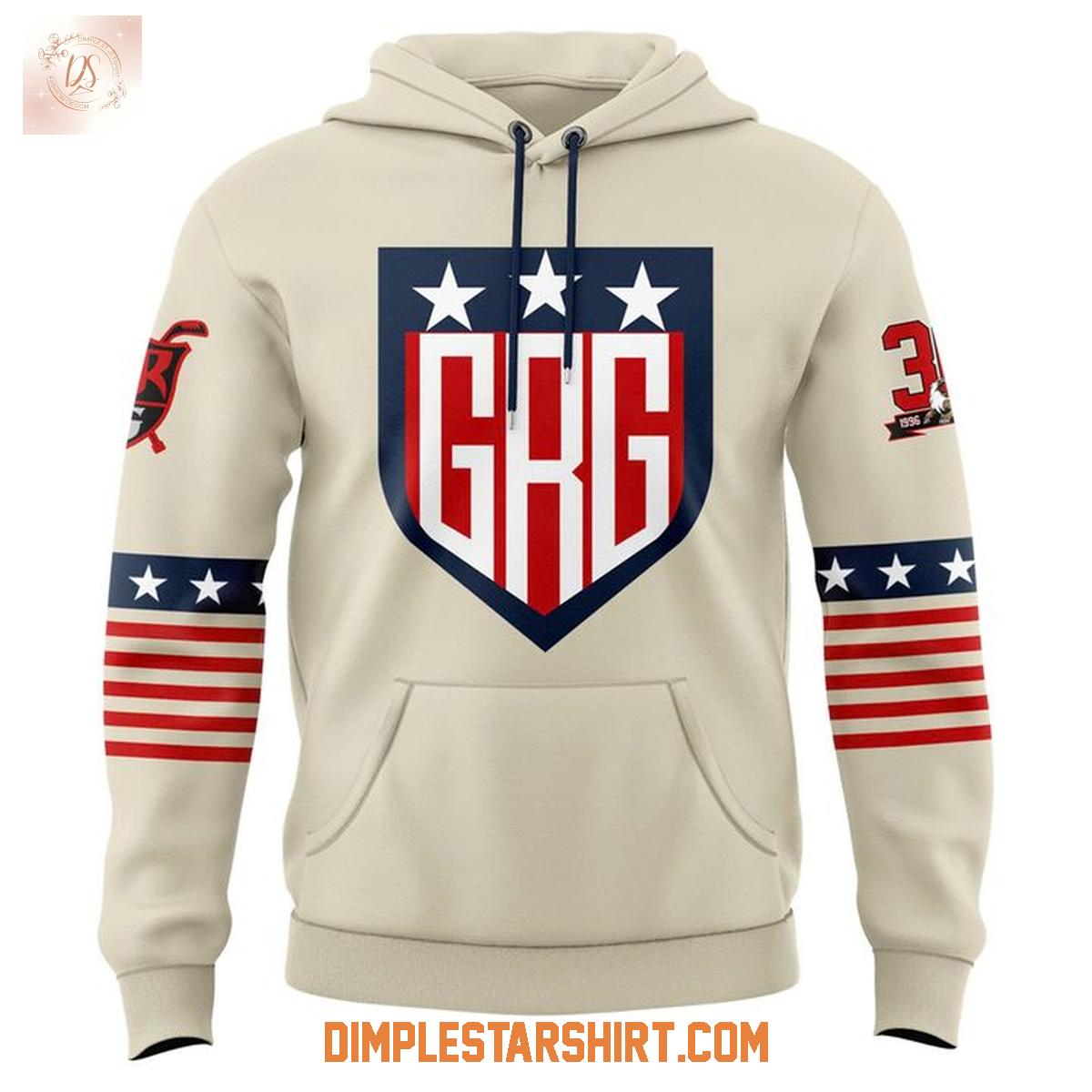 The design immediately commands attention with its striking cream-colored base, providing a crisp canvas for the bold graphics. On the front, a prominent shield emblem proudly displays "GRG" (Grand Rapids Griffins) in a vibrant red, framed by a dark blue outline and accented with three white stars above, evoking a strong sense of national pride and team identity. A practical kangaroo pocket offers warmth and convenience.