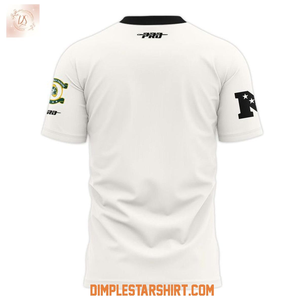 Every detail on this shirt speaks to its authenticity and quality. The left sleeve features a distinctive black square patch with a bold white 'F' accented by three stars, adding a unique, perhaps collegiate, touch. On the right sleeve, the official Green Bay Packers 'G' logo is prominently showcased within a circular emblem, affirming its genuine team affiliation. Subtle "-PRO-" branding near the collar and on the back neckline further suggests a commitment to performance-inspired quality. An official NFL shield logo at the bottom hem completes the design, ensuring its league authenticity.