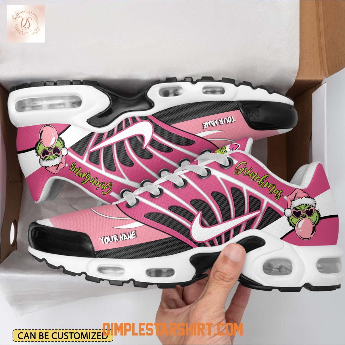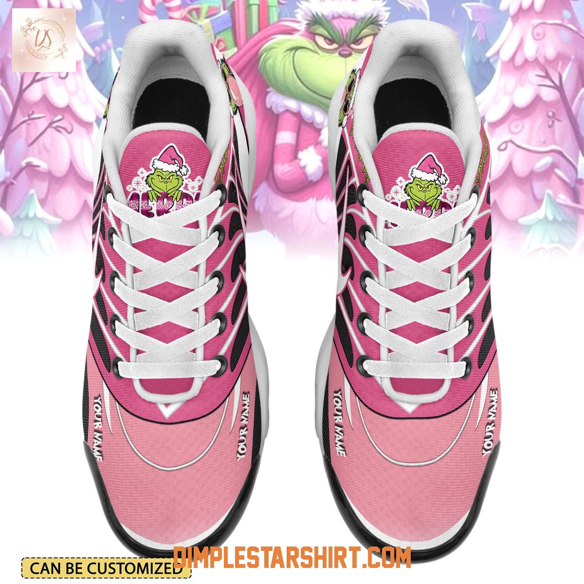 The shoes feature a striking pink base complemented by sophisticated black detailing, creating a visually appealing contrast. The hallmark Air Max cushioning system ensures exceptional comfort and support throughout the day. Custom Grinch-inspired graphics add a touch of lightheartedness and individuality, transforming these shoes into a captivating conversation piece wherever you venture. These details are carefully integrated to provide a unique yet wearable expression of holiday cheer.