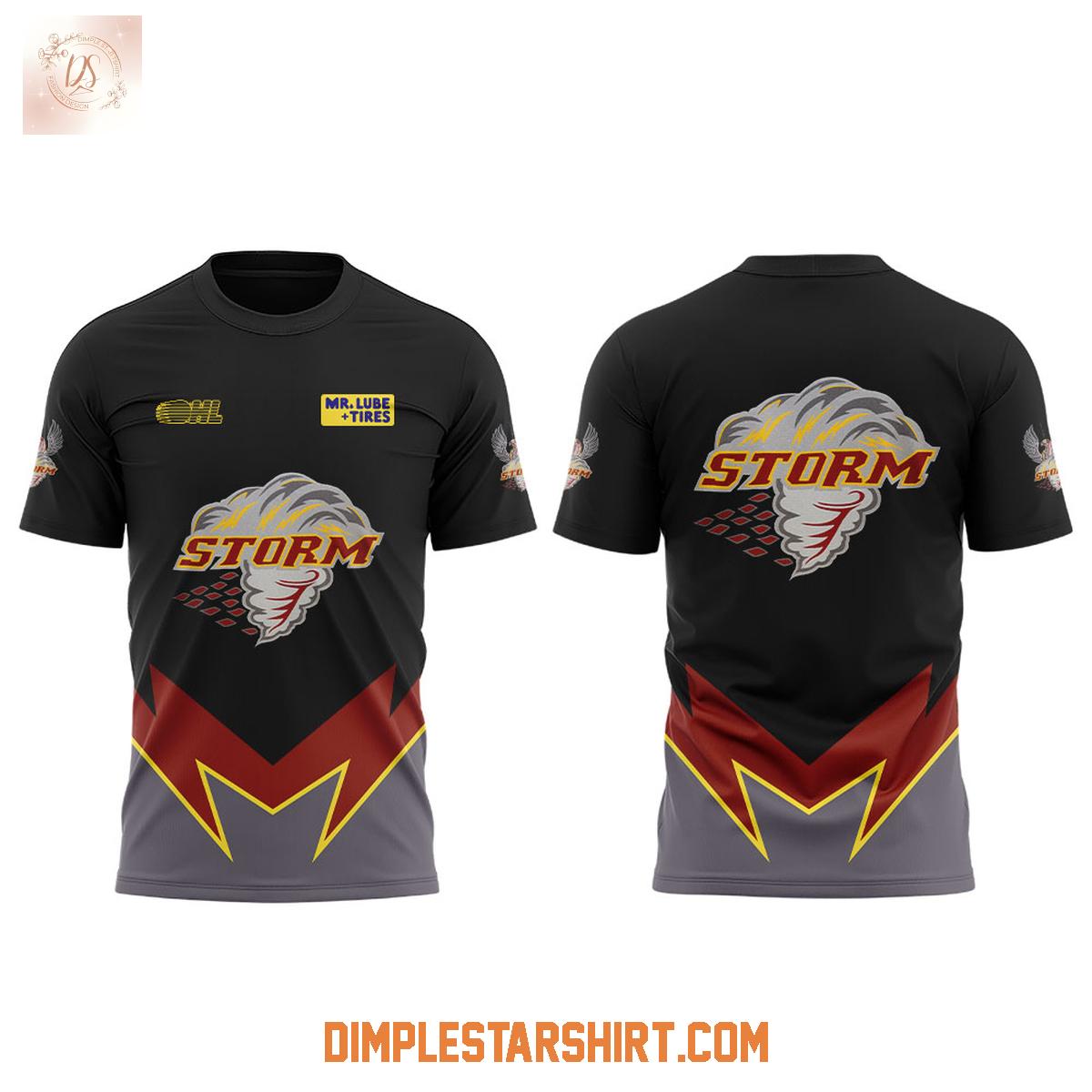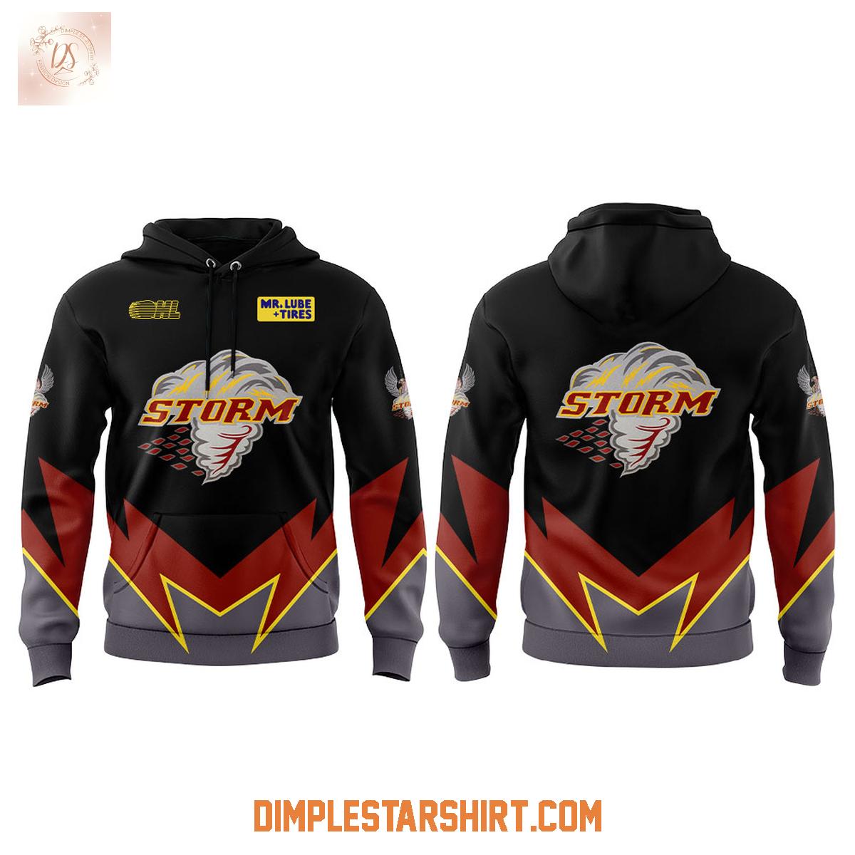 The hoodie t-shirt proudly displays the team's iconic imagery, with the unmistakable "Storm" logo taking center stage. The meticulously incorporated commemorative design elements elevate this piece, making it a true standout. The carefully chosen color scheme, characterized by its bold and appealing contrasts, ensures you'll capture attention whether you're passionately cheering at the Sleeman Centre or simply navigating your daily routine.