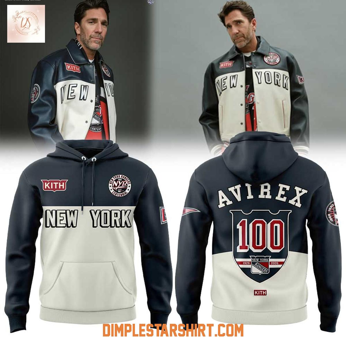 Crafted from a comfortable and durable fabric blend, this hoodie is designed for everyday wear. The prominent "NEW YORK" across the chest, coupled with the Rangers' centennial logo, makes a bold statement of team pride. The Kith branding adds a touch of exclusivity, elevating the design beyond typical fan gear. Furthermore, the "AVIREX 100" detail on the back enriches the collaborative design, adding another layer of sophistication and heritage.