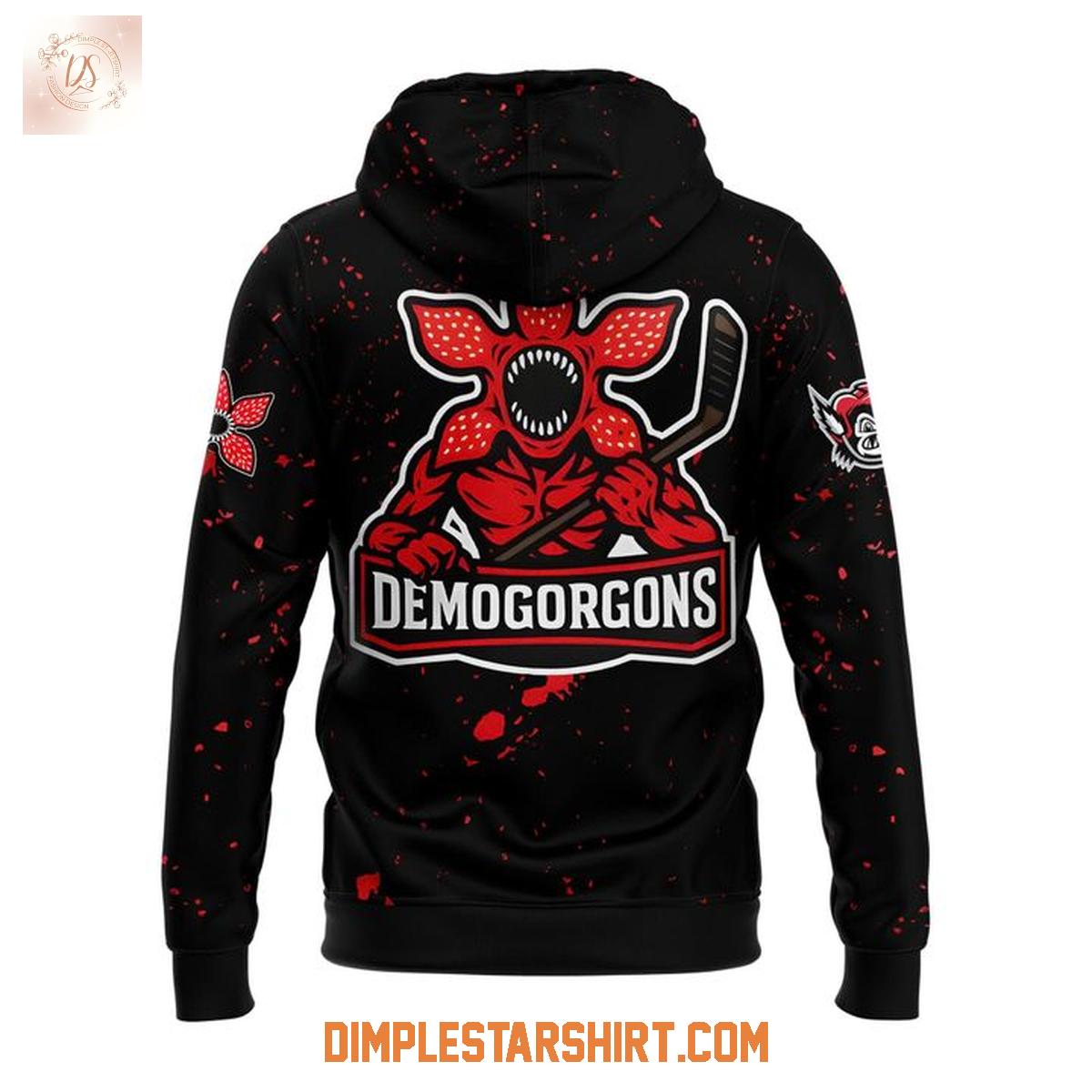 This striking hoodie features a vibrant design that incorporates elements from both franchises. On the front, you'll find the Huntsville Havoc logo intertwined with imagery reminiscent of the Upside Down, creating a visually appealing contrast. The back showcases a Demogorgon graphic, cleverly integrated with hockey sticks, making it a must-have for fans of both the team and the show. The red and black color scheme adds a touch of edginess to the overall look.