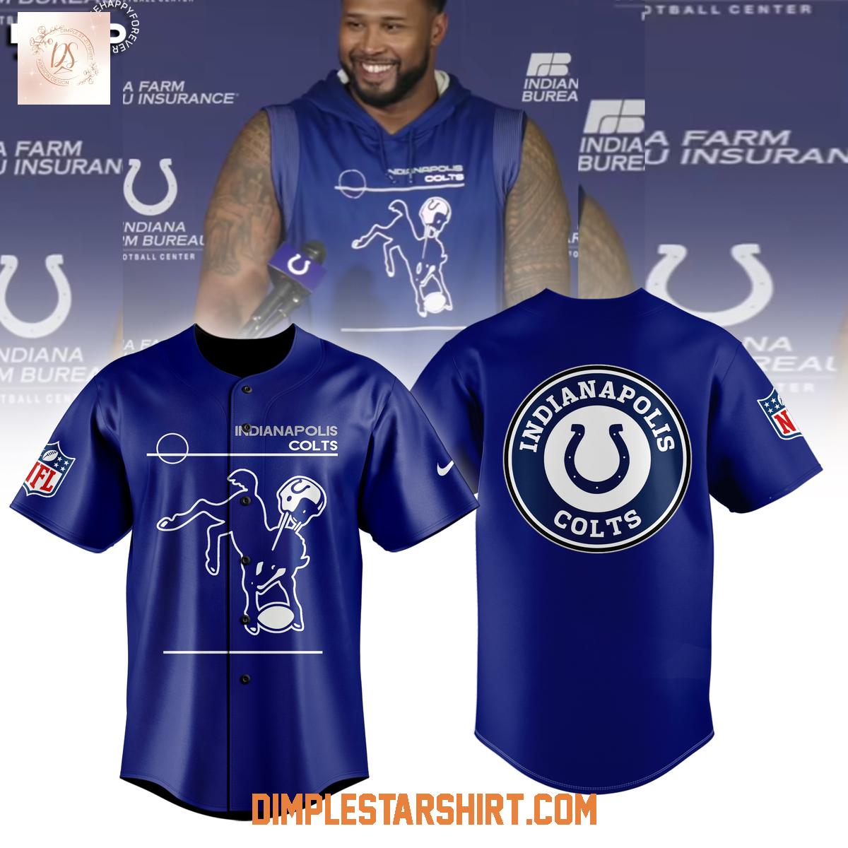 Crafted in the iconic royal blue, this full-button jersey immediately captures attention. The front proudly features "INDIANAPOLIS COLTS" above a dynamic, stylized graphic depicting a player on horseback, football in hand—a unique artistic interpretation that embodies the team's spirit and historical roots. On the sleeves, you'll find the authentic NFL shield logo and the recognizable Nike swoosh, signifying official league and brand quality.
