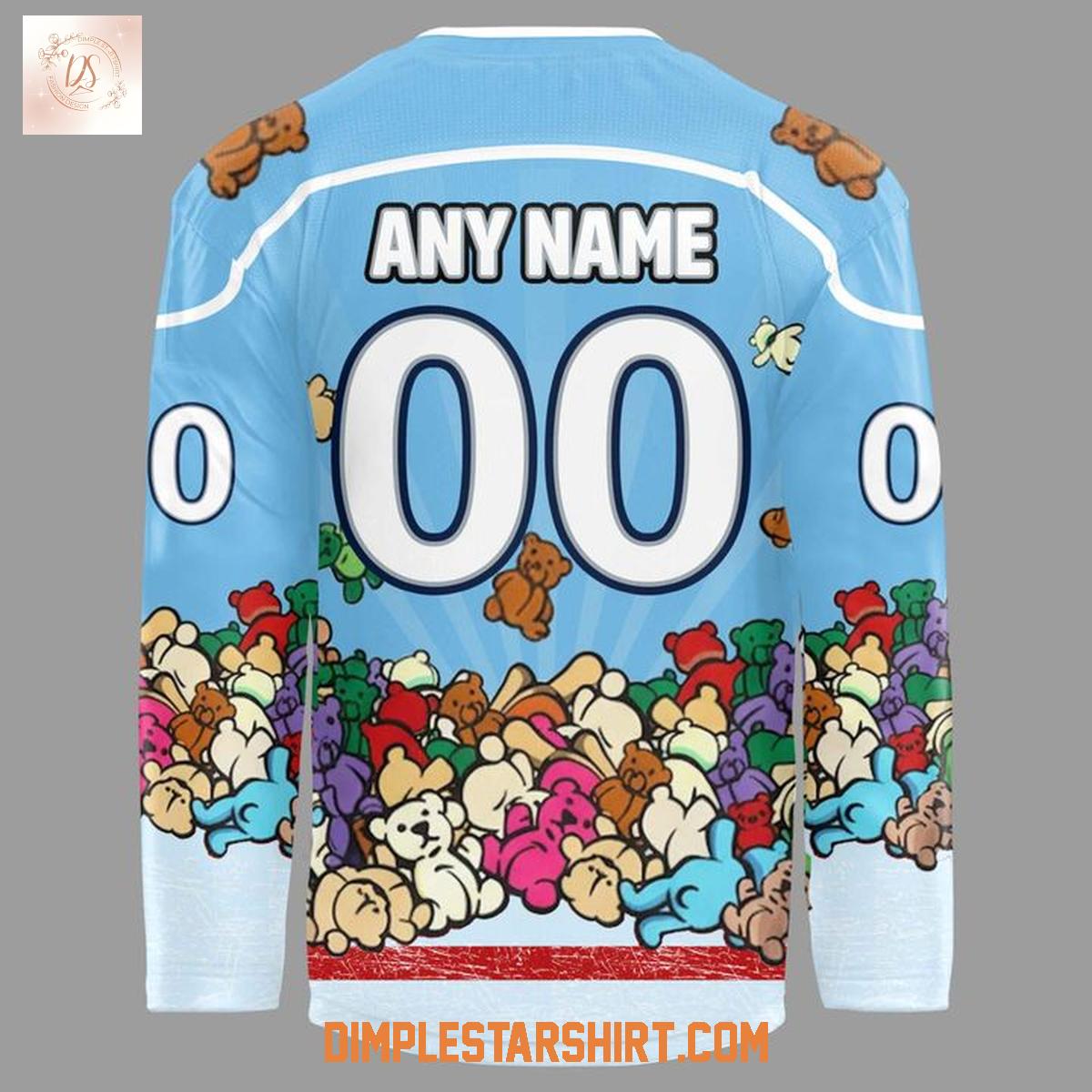 Turning to the reverse, the customizability truly shines. Fans can personalize their jersey with "ANY NAME" proudly displayed above large, crisp white numbers, allowing for a unique connection to the team or the event itself. The delightful teddy bear pattern continues across the lower back, ensuring the festive motif is visible from every angle. This thoughtful design makes it a perfect keepsake for any dedicated IceMen fan or hockey jersey collector.