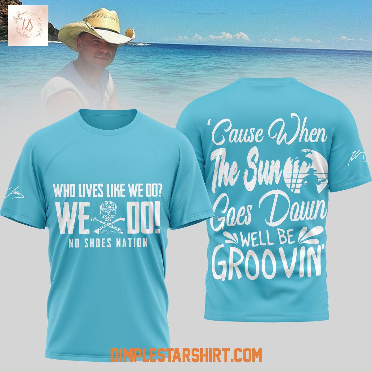 This comfortable tee prominently features the phrase "Who Lives Like We Do? WE DO!" on the front, along with a subtle "No Shoes Nation" detail. The back continues the theme with "Cause When The Sun Goes Down Well Be Groovin'", evoking memories of beach bonfires and carefree summer nights. The design uses a gradient of blues that give a fresh, coastal vibe.