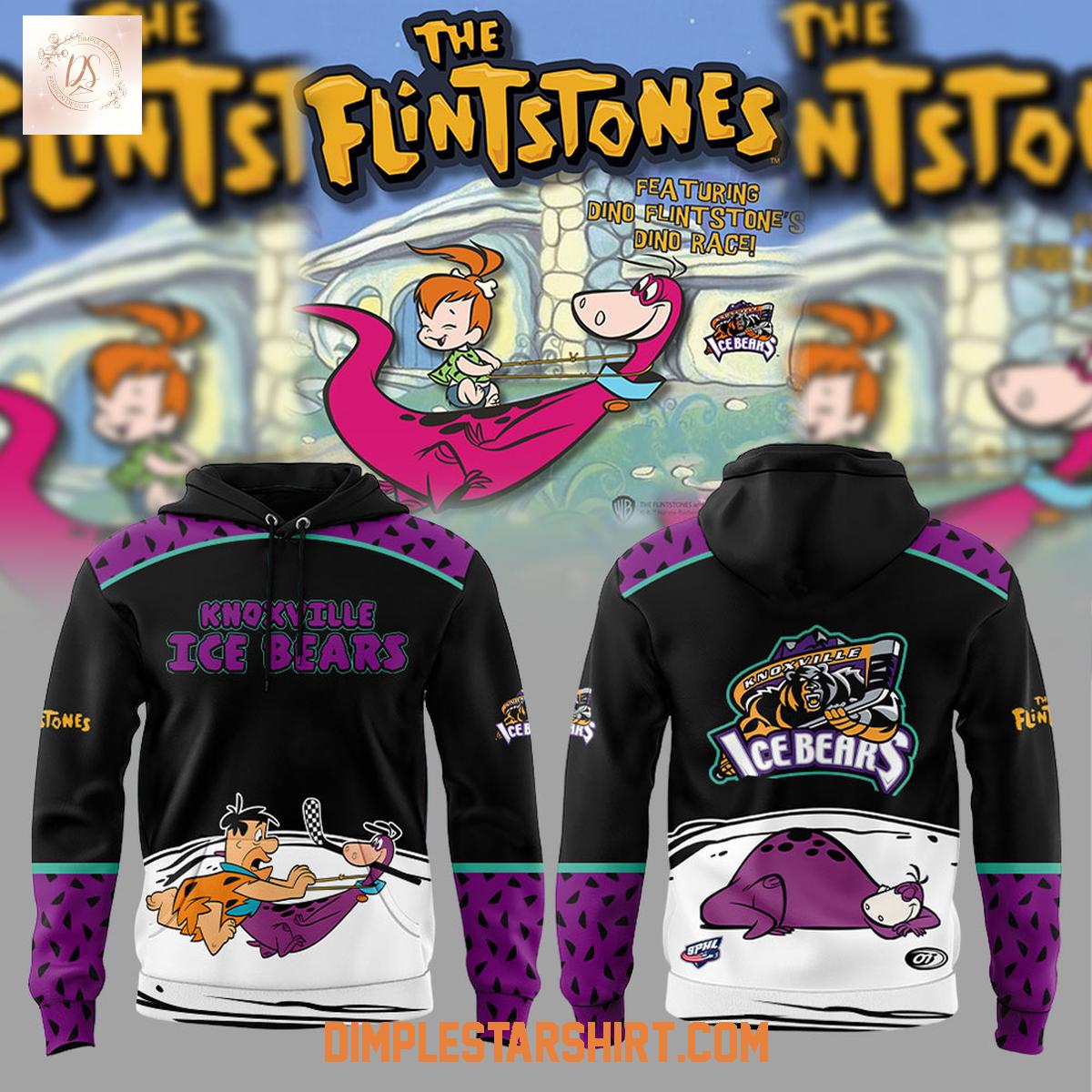 Show your love for hockey and a certain prehistoric family with the Knoxville Ice Bears The Flintstones Dino Hoodie T-Shirt. This unique apparel combines the iconic imagery of The Flintstones with the spirit of your favorite hockey team, creating a fun and eye-catching design suitable for game days or casual wear.
