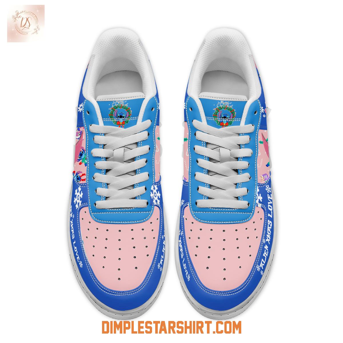 These striking shoes showcase a cheerful Christmas motif, prominently featuring everyone's favorite alien experiments, Stitch and Angel, in playful holiday scenarios. The design utilizes a delightful pink and blue color blocking, creating an eye-catching base that perfectly complements the festive artwork, all while maintaining the classic Air Force 1 silhouette.