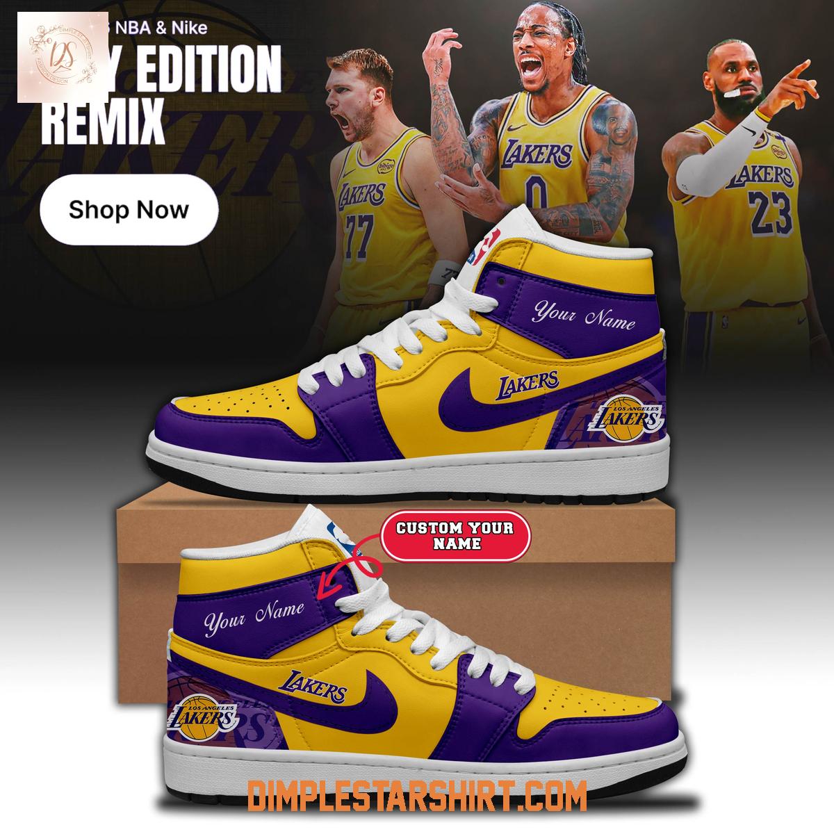 Crafted with a combination of premium leather and durable synthetic materials, these shoes offer a comfortable and supportive fit. The high-top design provides excellent ankle support, while the cushioned midsole ensures all-day comfort, whether you're hitting the court or navigating city streets. The iconic Nike swoosh is prominently displayed, complementing the Lakers-themed color palette.