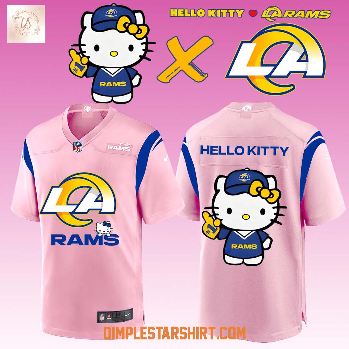 The special edition jersey features the iconic Rams logo boldly displayed on the front, complemented by a delightful Hello Kitty graphic. The back of the jersey proudly showcases "Hello Kitty" printed above an endearing depiction of the character sporting official Rams gear. The jersey's vibrant team colors and meticulous detailing ensure it stands out as a remarkable addition to any fan's collection.