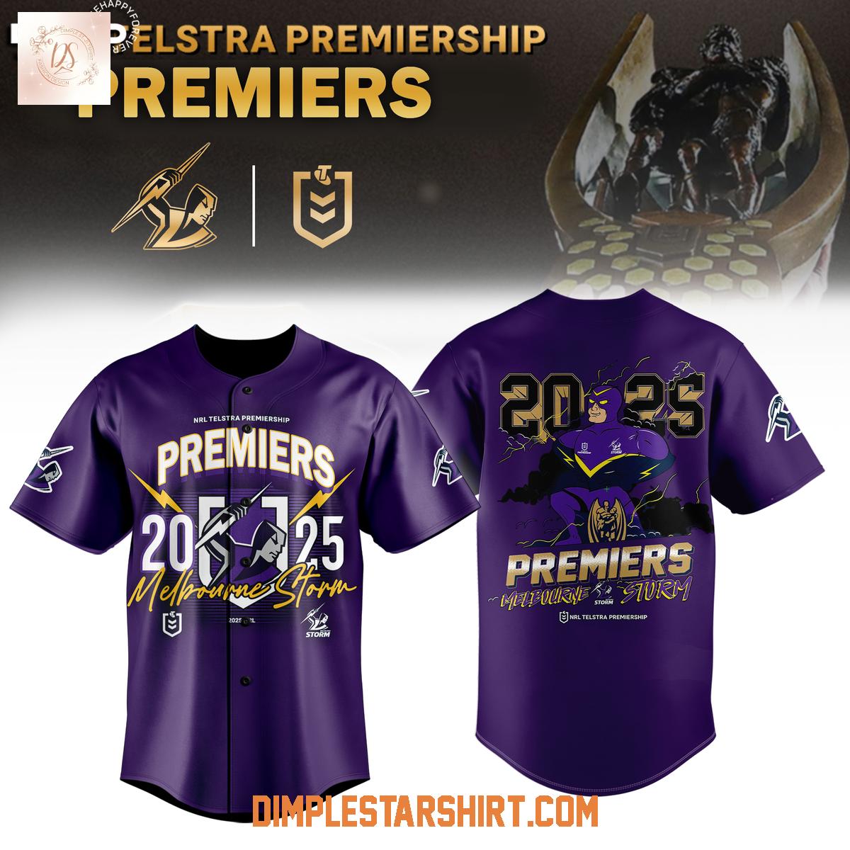 Crafted in the iconic purple, the jersey's front proudly displays "NRL Telstra Premiership Premiers 2025." The bold gold lettering for "Premiers" commands immediate attention, flanked by dynamic lightning bolt motifs that brilliantly capture the team's electrifying play. An integrated Melbourne Storm 'S' logo subtly embedded within the "2025" design signifies the club's enduring spirit and anticipated future championships.
