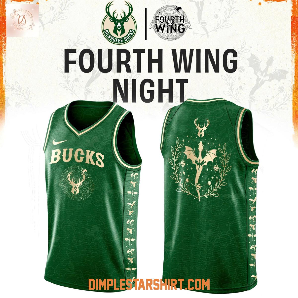 Celebrate the thrilling intersection of fantasy and basketball with the Milwaukee Bucks Fourth Wing Night Basketball Jersey. This unique jersey commemorates a special themed game night, blending the iconic imagery of the Milwaukee Bucks with the captivating world of the "Fourth Wing" book series. It's a must-have for fans who appreciate both high-flying dunks and epic storytelling.