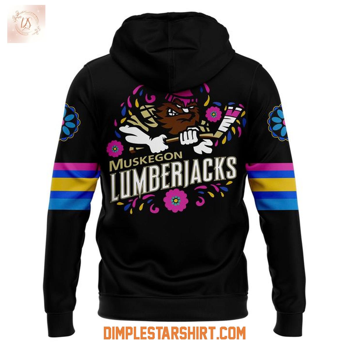 The front of this striking hoodie features a central graphic that immediately captures attention: a detailed sugar skull, or calavera, adorned with a hockey helmet. This iconic symbol of Dia de los Muertos is flanked by crossed hockey sticks, seamlessly integrating the team's sport. Surrounding the skull are intricate floral patterns, reminiscent of marigolds, and flickering candle imagery, all rendered in a lively palette of pink, blue, yellow, and white against the deep black fabric. Below this vibrant artwork, the "Muskegon Lumberjacks" name is proudly displayed.