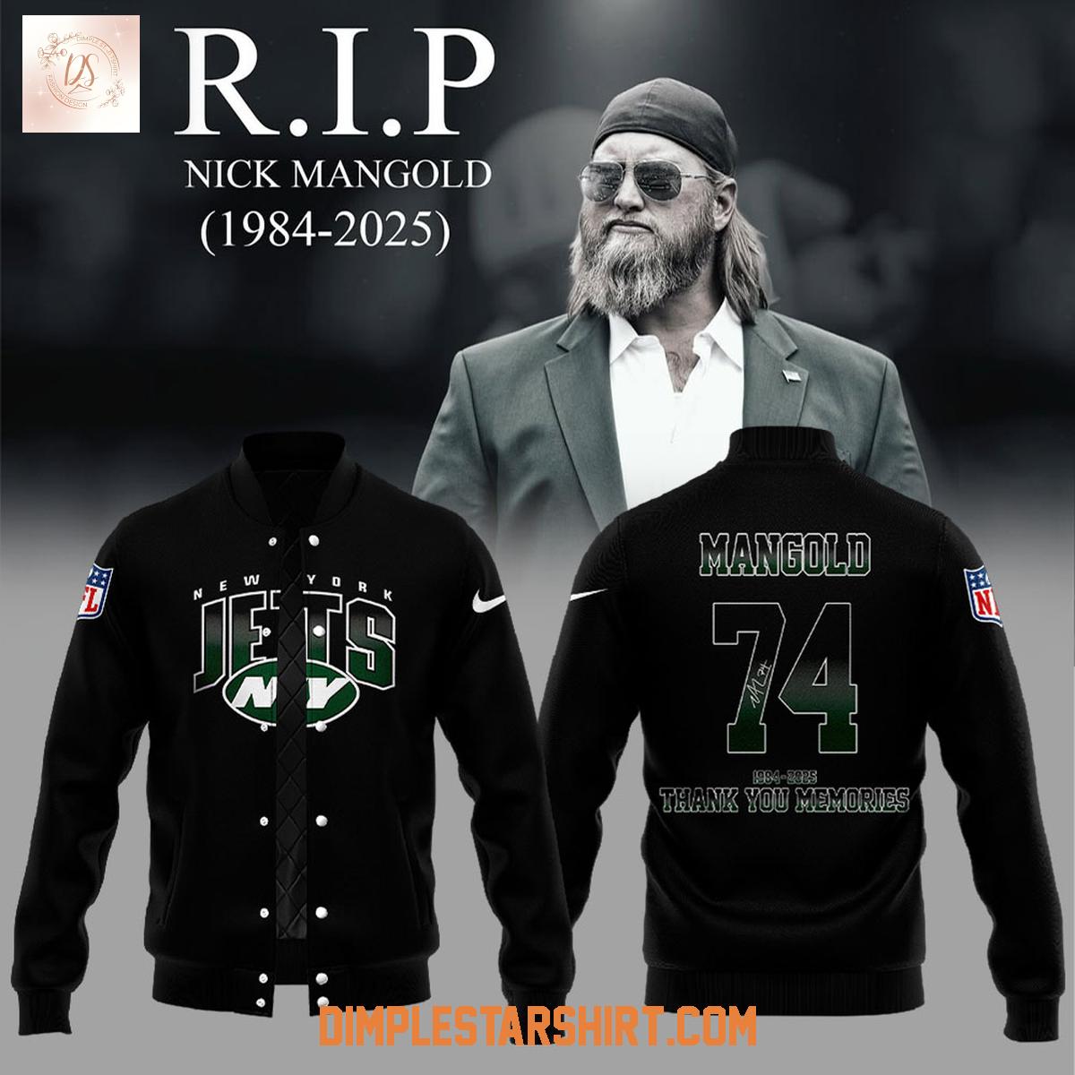 Turning to the reverse, the jacket truly becomes a commemorative statement. "MANGOLD" is prominently displayed above his legendary jersey number "74," rendered in bold green. Below, a stylized graphic, possibly representing his signature, is accompanied by the poignant dates "1984-2025" and the heartfelt message "THANK YOU MEMORIES." This design ensures that his impact on the Jets and their dedicated fanbase is honored with respect and permanence.