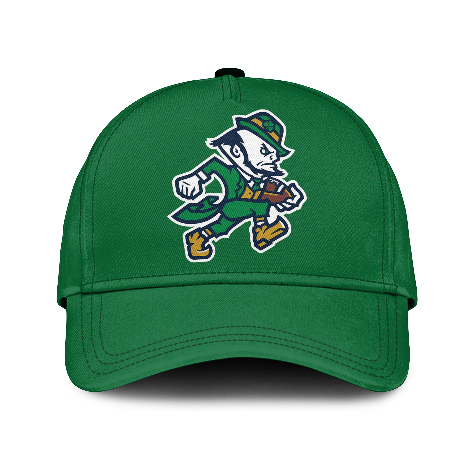 The cap proudly displays the iconic Fighting Irish logo prominently embroidered on the front. The raised embroidery adds a touch of dimension and sophistication, further highlighting the team's spirit and rich tradition. The vibrant team colors make a bold and unmistakable statement, leaving no doubt about your loyalty and passion for Notre Dame athletics.