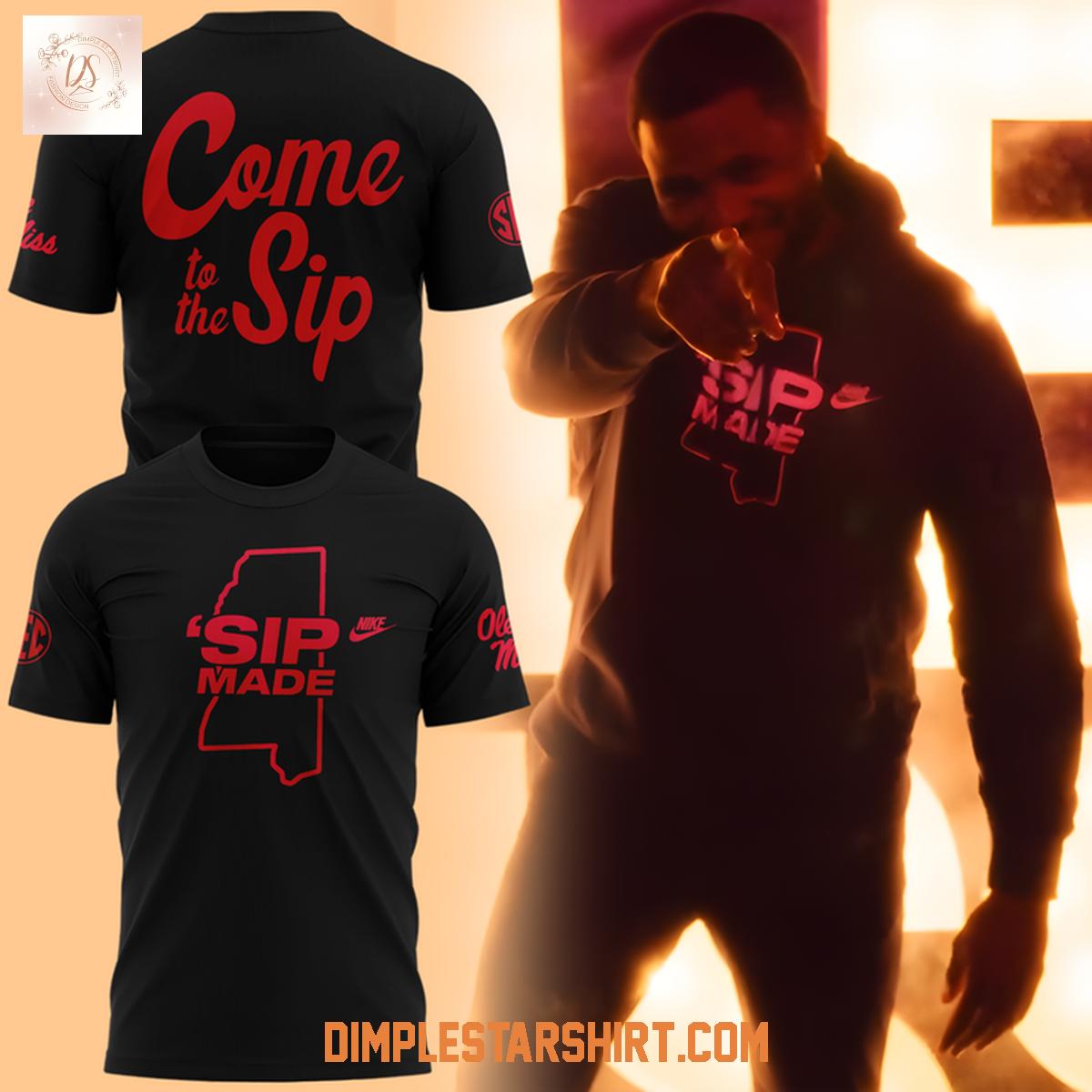 The design features bold, eye-catching graphics that proudly display your Ole Miss pride. The front prominently showcases "Sip Made" in a distinctive font, a clear reference to the beloved "Ole Miss" nickname. Turning to the back, the phrase "Come to the Sip" extends an invitation to experience the lively and welcoming atmosphere of Oxford firsthand. These carefully chosen details leave no doubt about where your loyalties lie.