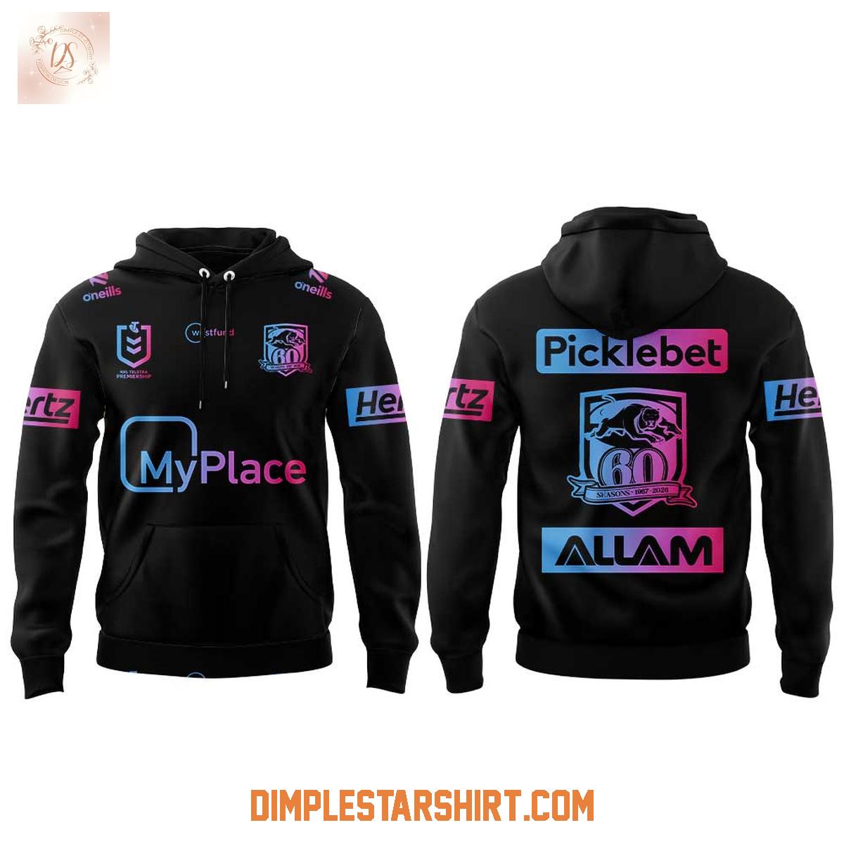 The design showcases a modern aesthetic with the team's emblem and sponsor logos displayed clearly on the front and back. The inclusion of the "60 Seasons" badge pays tribute to the club's rich history and achievements. This garment is more than just apparel; it's a symbol of your connection to the Penrith Panthers community.