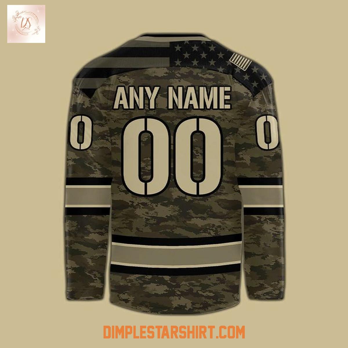 This special edition hockey jersey features a striking camouflage design, incorporating the Ice Flyers team logo prominently on the front. The American flag is subtly integrated into the shoulder design, adding a patriotic touch. Bold team colors accentuate the sleeves and bottom hem, creating a visually appealing contrast. The jersey is designed to be comfortable whether you're cheering from the stands or wearing it casually around town.
