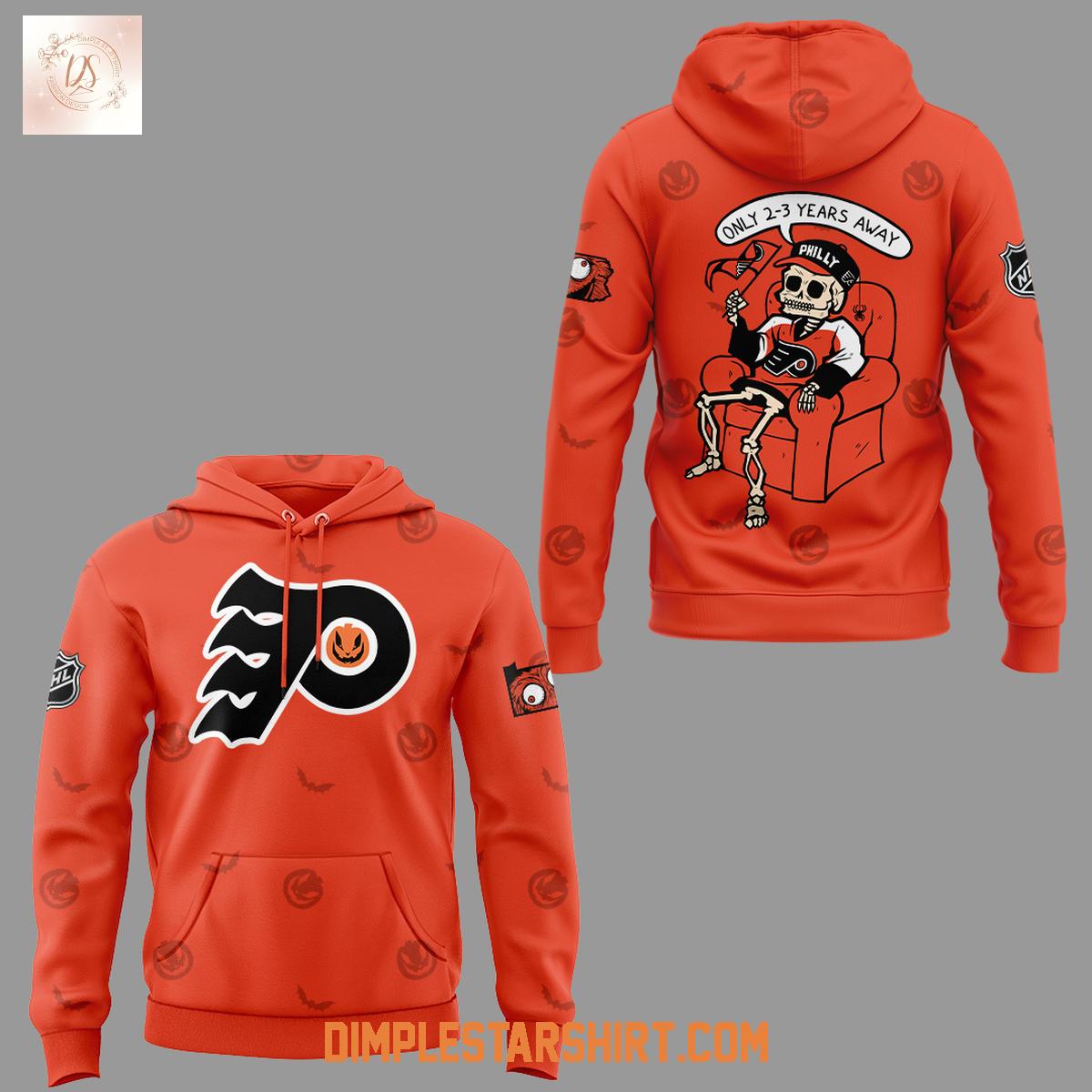 The reverse side unveils a truly distinctive graphic: a skeleton, comfortably seated in an armchair, donning a Flyers jersey, and holding a hockey stick. Above this humorous scene, a speech bubble reads, "ONLY 2-3 YEARS AWAY PHILLY," a clever, insider nod that resonates deeply with long-time fans, demonstrating a profound understanding of the team's journey and aspirations. Subtle repeating patterns of bats and ghostly pumpkin faces adorn the sleeves and body, enhancing the overall Halloween theme.