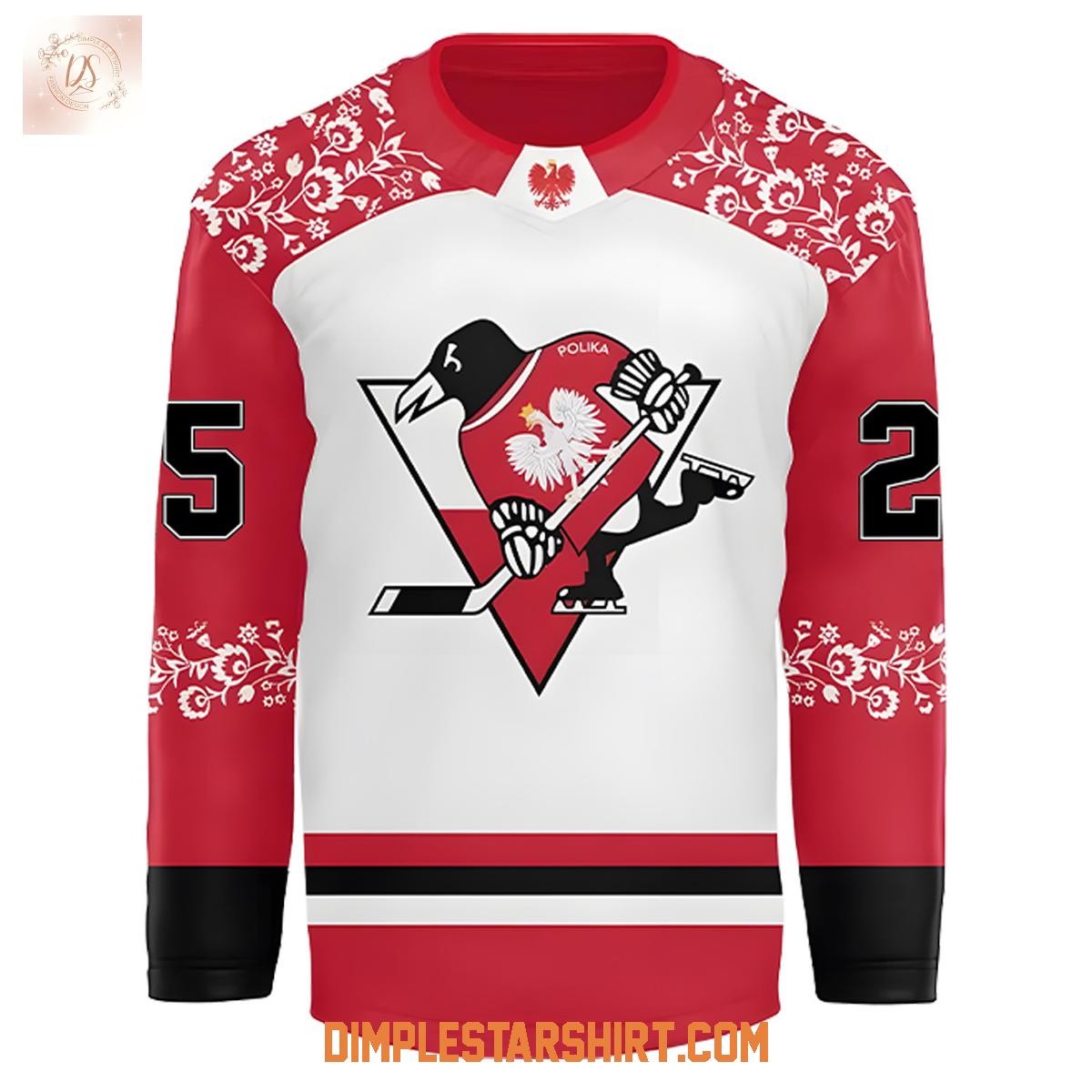 Crafted from what appears to be a durable, high-quality fabric, this hockey jersey is designed for comfort and longevity. Its robust construction makes it ideal for wearing to games, fan gatherings, or simply as a proud display of dual allegiance. While specifically commemorating the Polish Heritage Appreciation Night, its timeless design ensures it remains a cherished item for years, showcasing both your passion for the Pittsburgh Penguins and your appreciation for Polish culture.