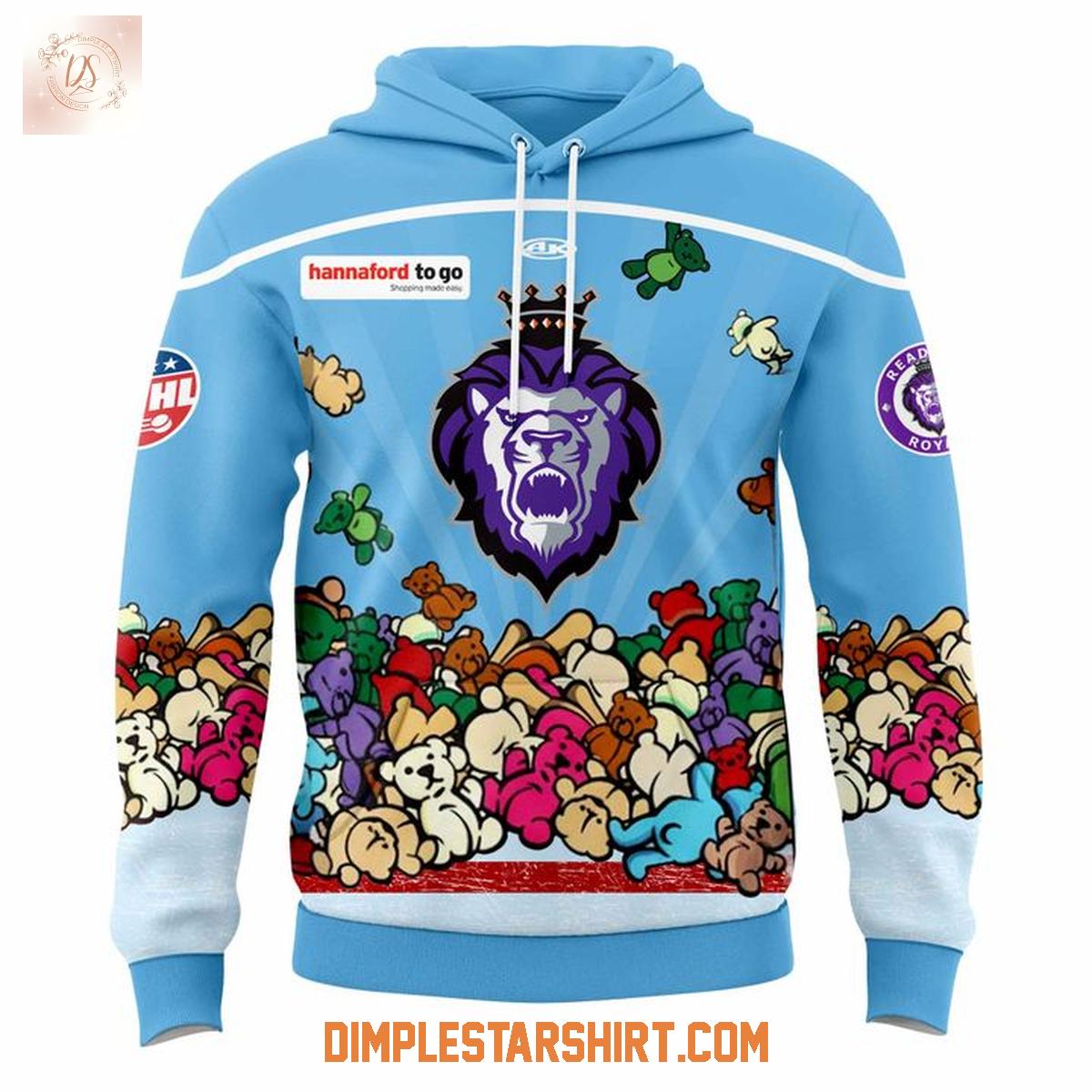 Immerse yourself in the heartwarming spirit of hockey and community with the exclusive Reading Royals Our Teddy Bear Toss 2025 Hoodie Shirt. This vibrant fan apparel isn't just a garment; it's a wearable celebration of one of the ECHL's most beloved traditions, capturing the joy and generosity of the annual Teddy Bear Toss game. Designed for the dedicated Royals supporter, it embodies the excitement of game day and the warmth of giving back.