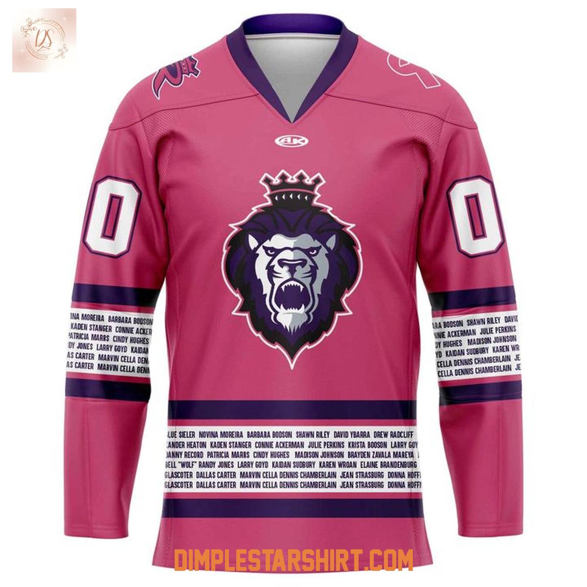 Crafted from breathable, performance-grade fabric, this hockey jersey ensures comfort whether you're cheering from the stands or engaging in a friendly game yourself. The material is lightweight and allows for a full range of motion, making it suitable for active wear. The vibrant pink color, combined with the team's iconic logo, creates a bold and memorable look. Names of people are printed on the bottom of the jersey.