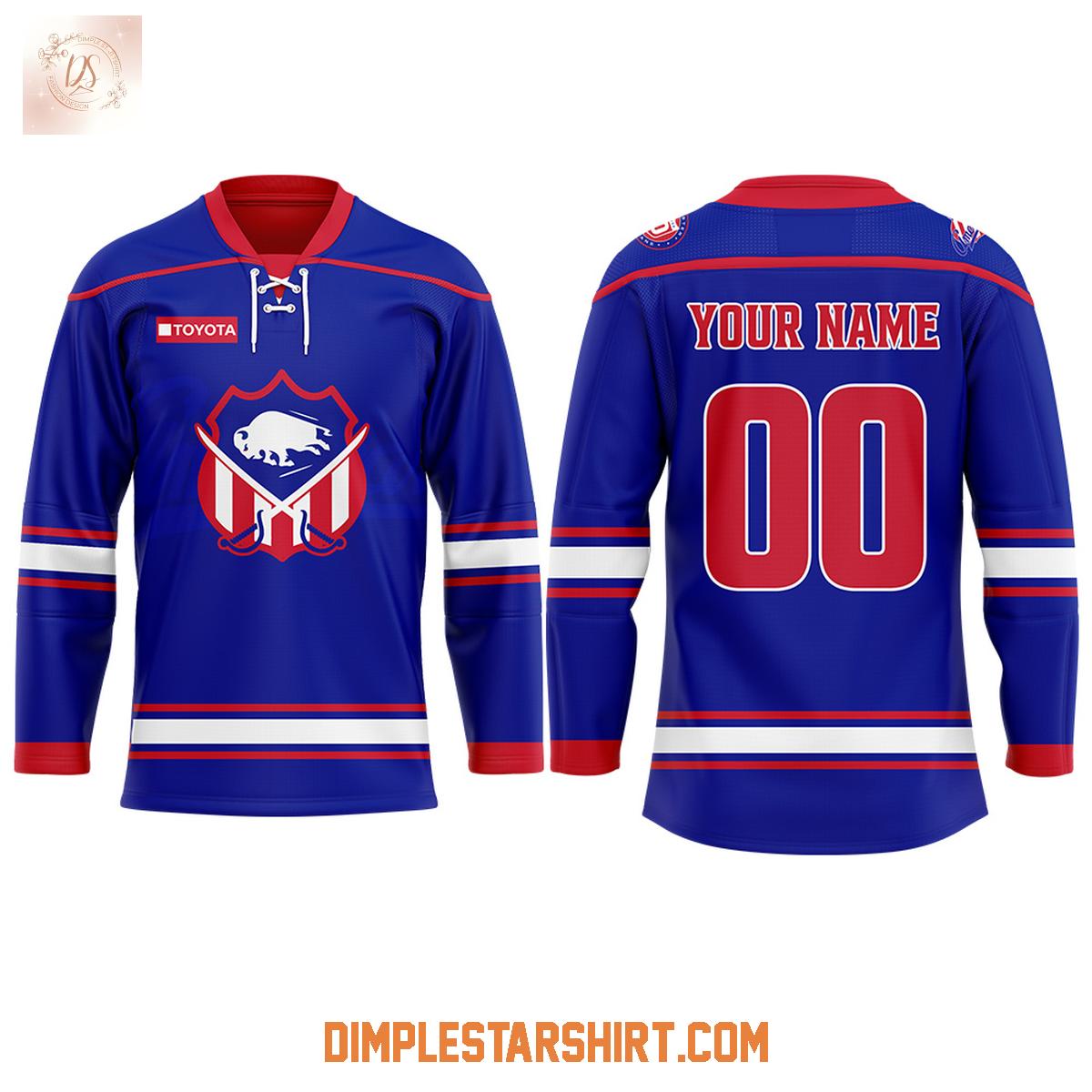 The jersey's vibrant royal blue base serves as a striking canvas for the classic red and white striping that characterized the Amerks' iconic look. Front and center, the legendary Amerks logo, featuring the charging buffalo and crossed swords, proudly proclaims your unwavering team allegiance. Constructed from durable and breathable materials, this jersey offers both superior comfort and long-lasting wear. It's a testament to quality craftsmanship, designed to withstand the rigors of game day and beyond.