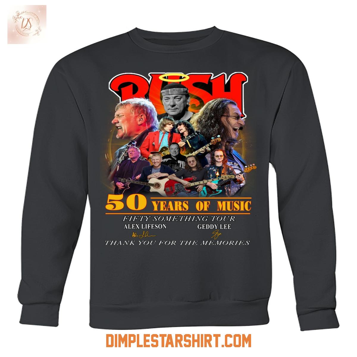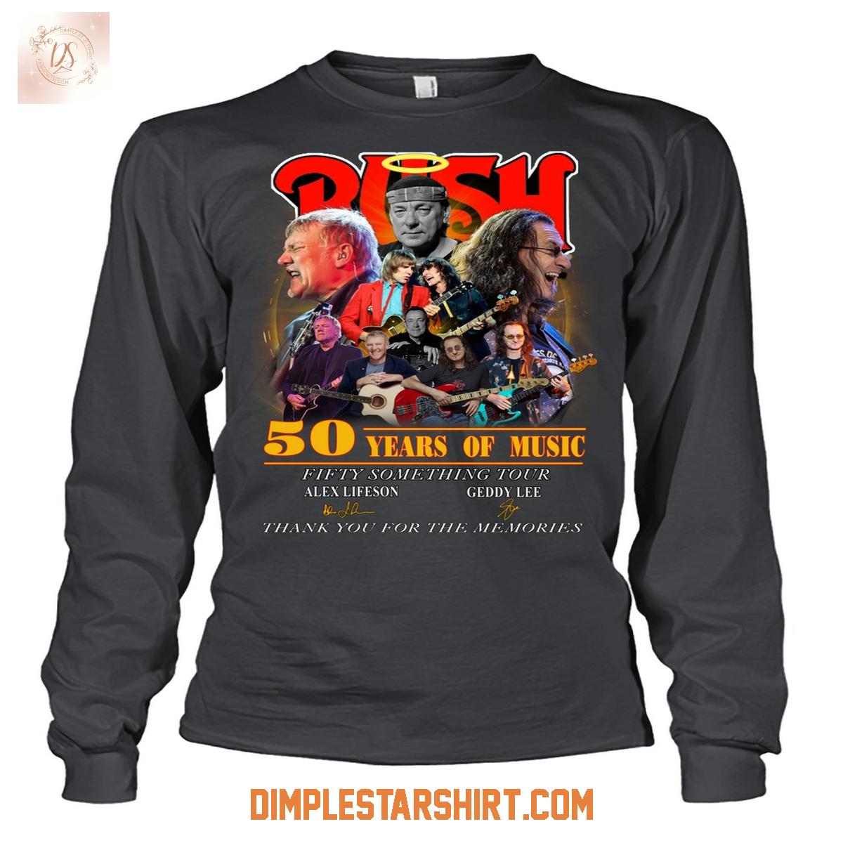 The "50 Years Of Music" emblem boldly marks this significant milestone, accompanied by "Fifty Something Tour," hinting at a retrospective celebration of their extensive discography. Below the main graphic, you'll find the authentic signatures of Alex Lifeson and Geddy Lee, adding an intimate, collectible touch that speaks directly to the band's personal connection with their audience. The heartfelt message, "Thank you for the memories," perfectly encapsulates the sentiment shared by millions of fans.