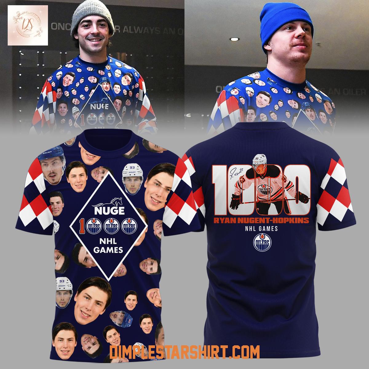 The design features eye-catching graphics that celebrate Nugent-Hopkins' achievement. The front showcases a collage of images capturing memorable moments from his career, while the back prominently displays his name and the "1000 NHL Games" milestone. The vibrant colors and detailed imagery ensure that this sweatshirt stands out in any crowd, making it a conversation starter among fellow hockey enthusiasts.