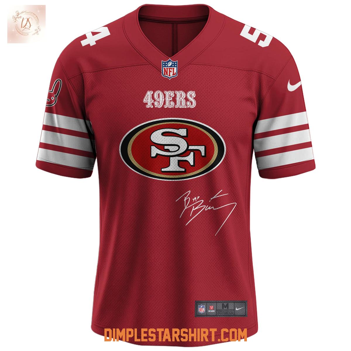 Crafted in the signature scarlet red of the 49ers, the front of this jersey proudly displays the classic "49ERS" text above the renowned "SF" oval logo, instantly recognizable to any football aficionado. The official NFL shield logo is positioned at the V-neck, signifying authenticity and team allegiance. A distinctive element is the stylized Bad Bunny signature gracing the lower front, adding an exclusive, artist-approved touch to the traditional NFL aesthetic.