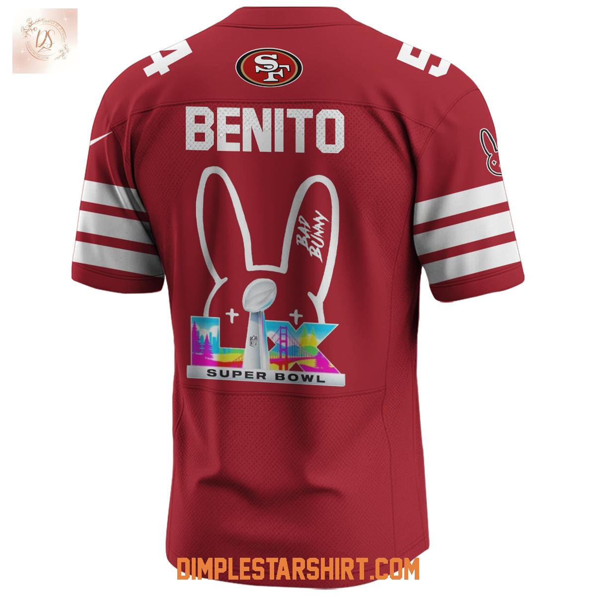 Turning to the back, the jersey celebrates Bad Bunny's identity with "BENITO" boldly printed as the nameplate. Below, a large, striking white Bad Bunny bunny logo takes center stage, subtly incorporating "BAD BUNNY" vertically along one ear. The design culminates in a vibrant graphic honoring the 2025 Super Bowl, featuring the coveted Super Bowl trophy alongside what appears to be the Golden Gate Bridge, encapsulating the spirit of San Francisco and the pinnacle of football achievement.