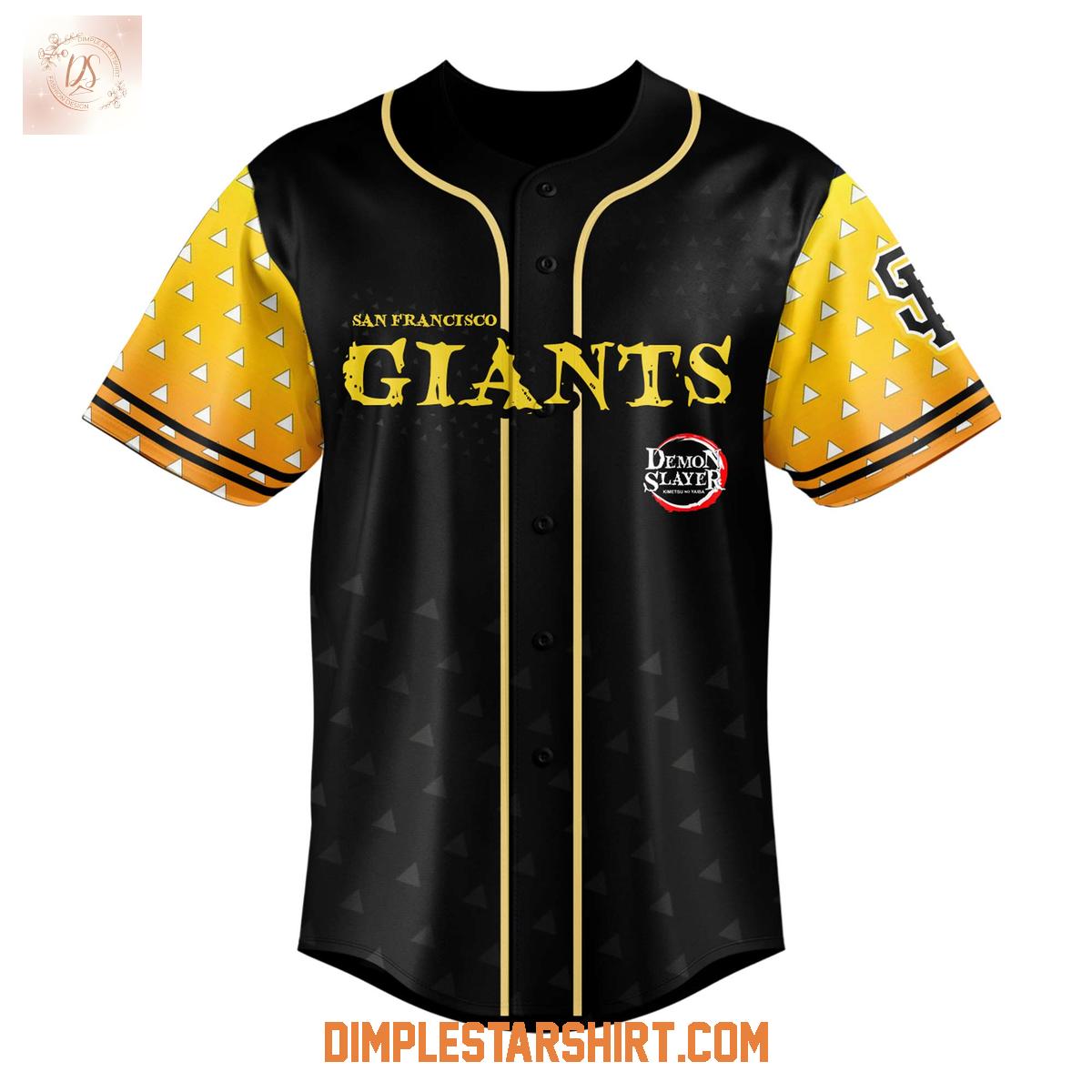 Observing the front, the jersey features a classic black base, accented with crisp gold piping along the placket and collar, reminiscent of traditional baseball jerseys. The bold "SAN FRANCISCO GIANTS" lettering across the chest, rendered in a striking gold, immediately establishes its MLB allegiance. Below, the official Demon Slayer Corps logo signifies the powerful anime collaboration, ensuring its authenticity for discerning fans.